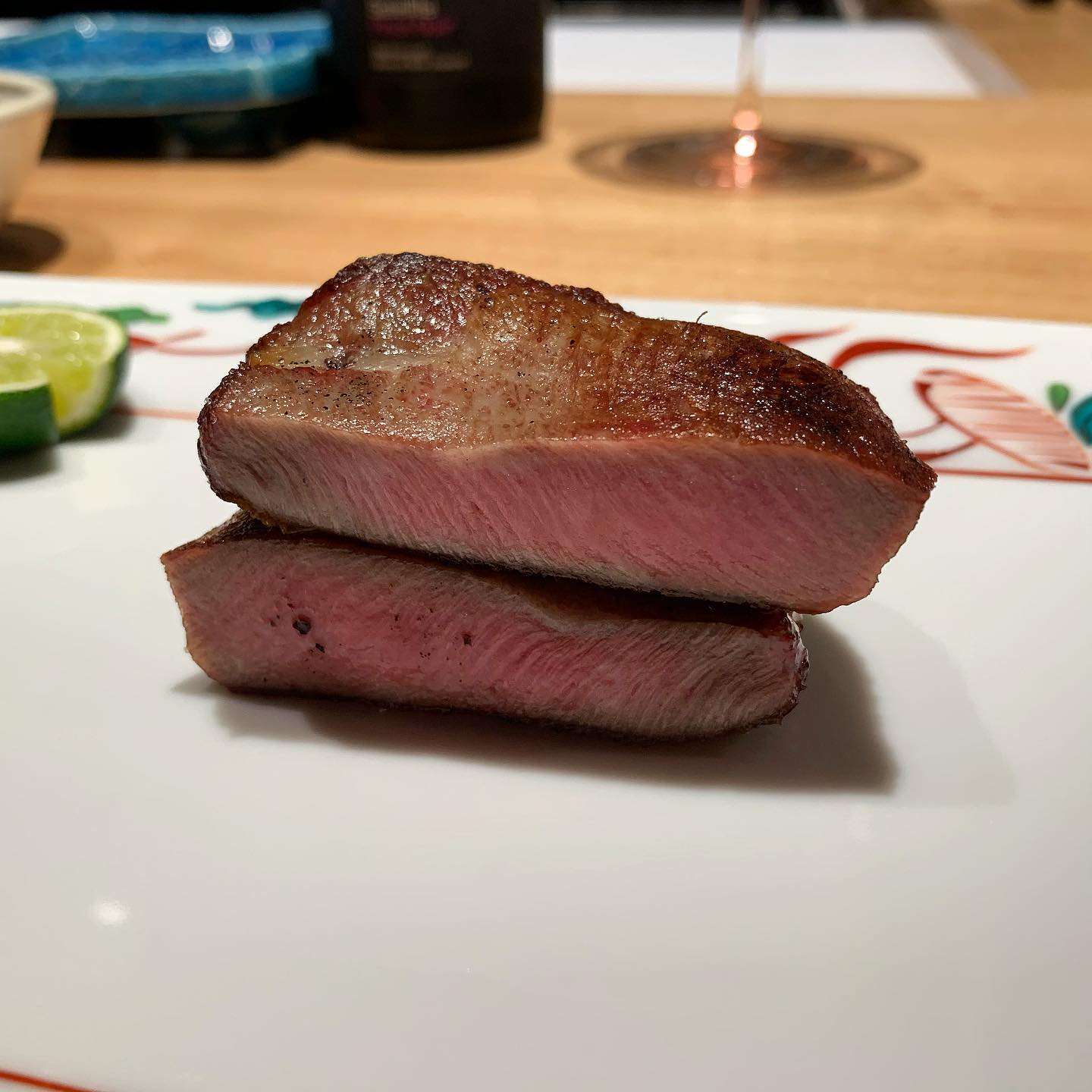 ⑦タンステーキ(熊本) ここからがメイン。捌きたてのタン元のステーキ。 とにかく食感が秀逸。さっぱり塩と酢橘でいただきました。 合わせるのはニュージーのピノ・ノワール。 この辺で酔ってきたのでワインはストップ。