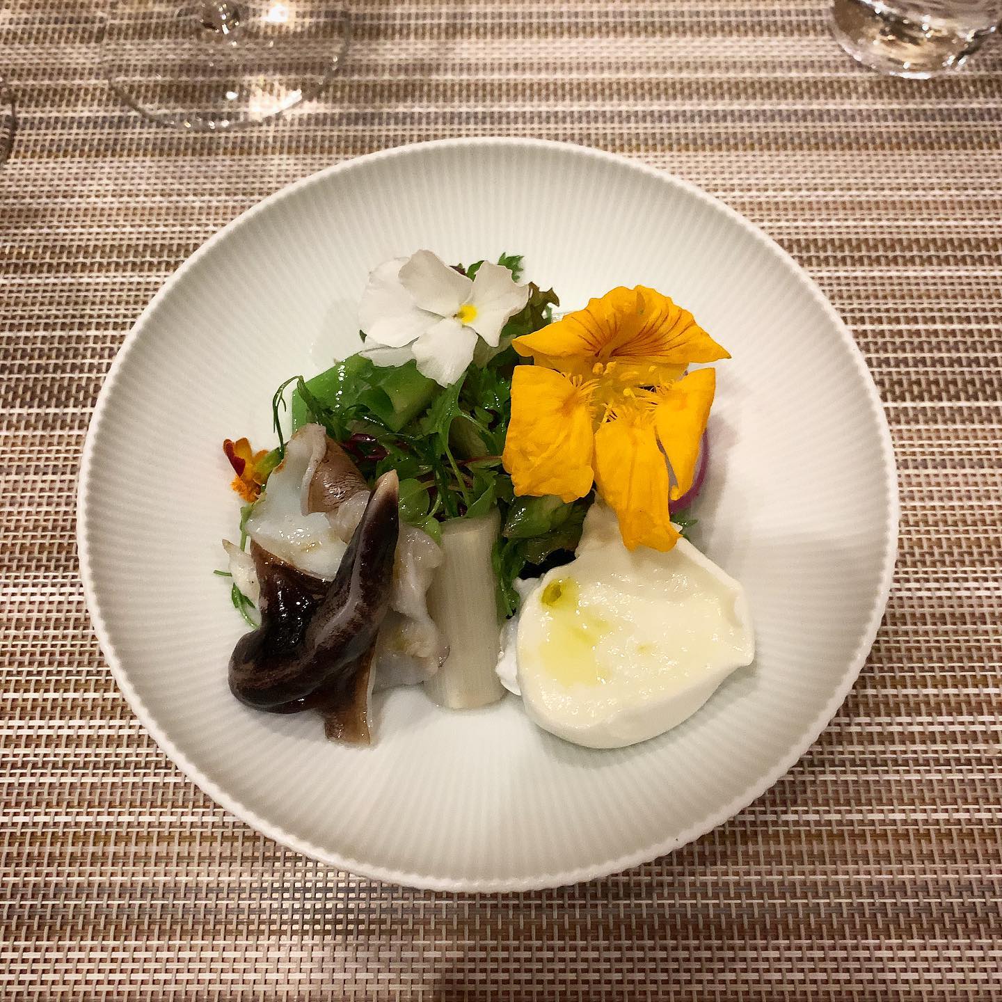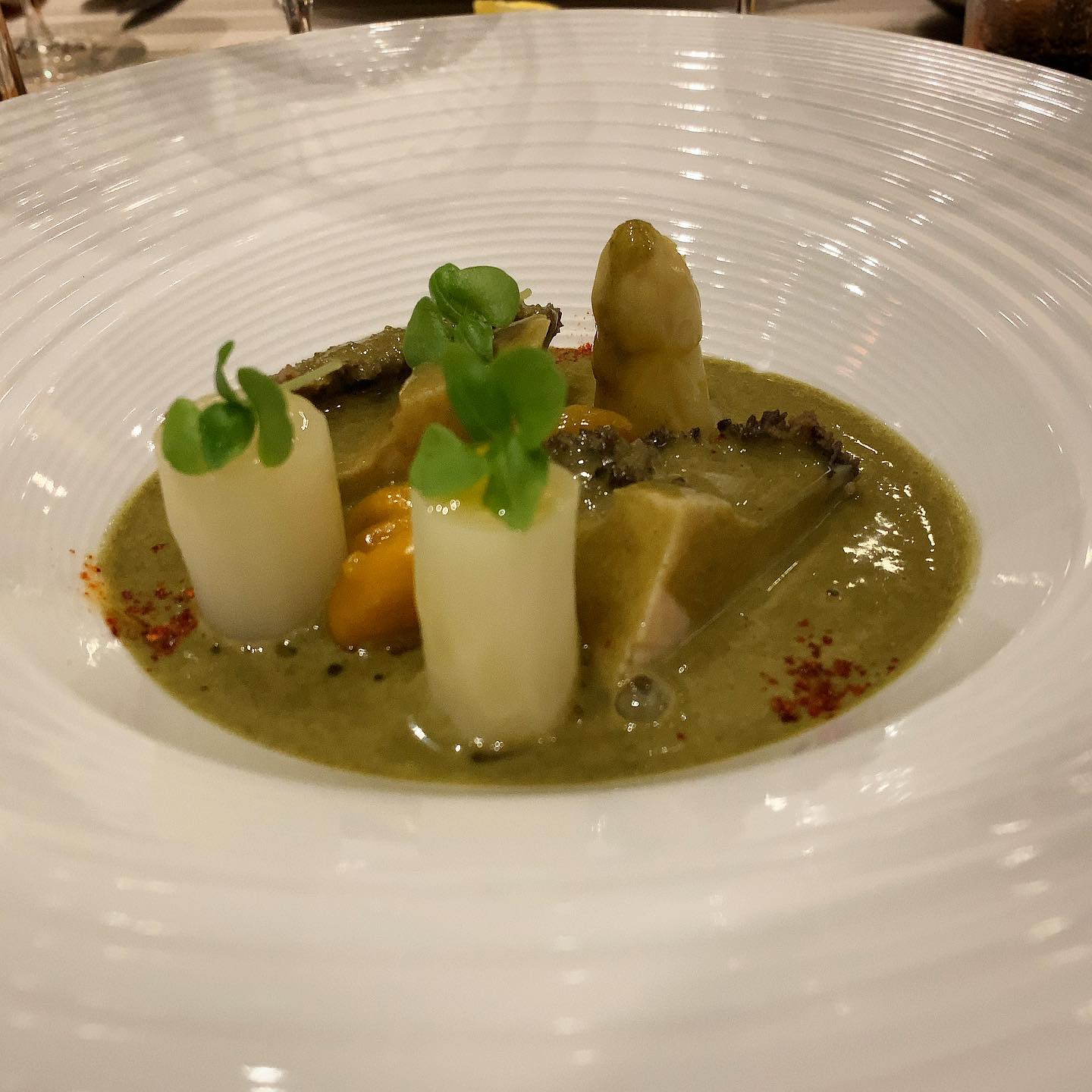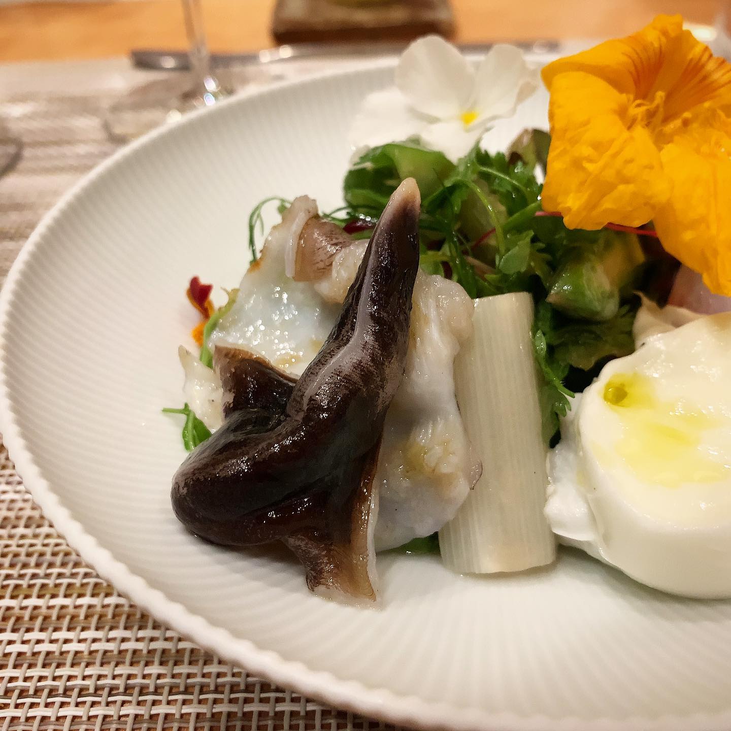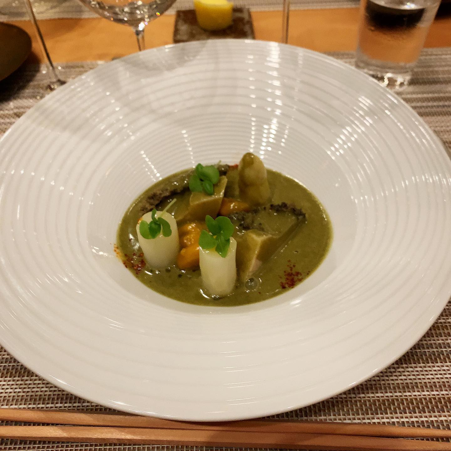 ◆器械根あわび(千葉大原)、ホワイトアスパラ(フランス)◎ あわびはもちろん肝ソースが絶品。かぼちゃのニョッキも〇