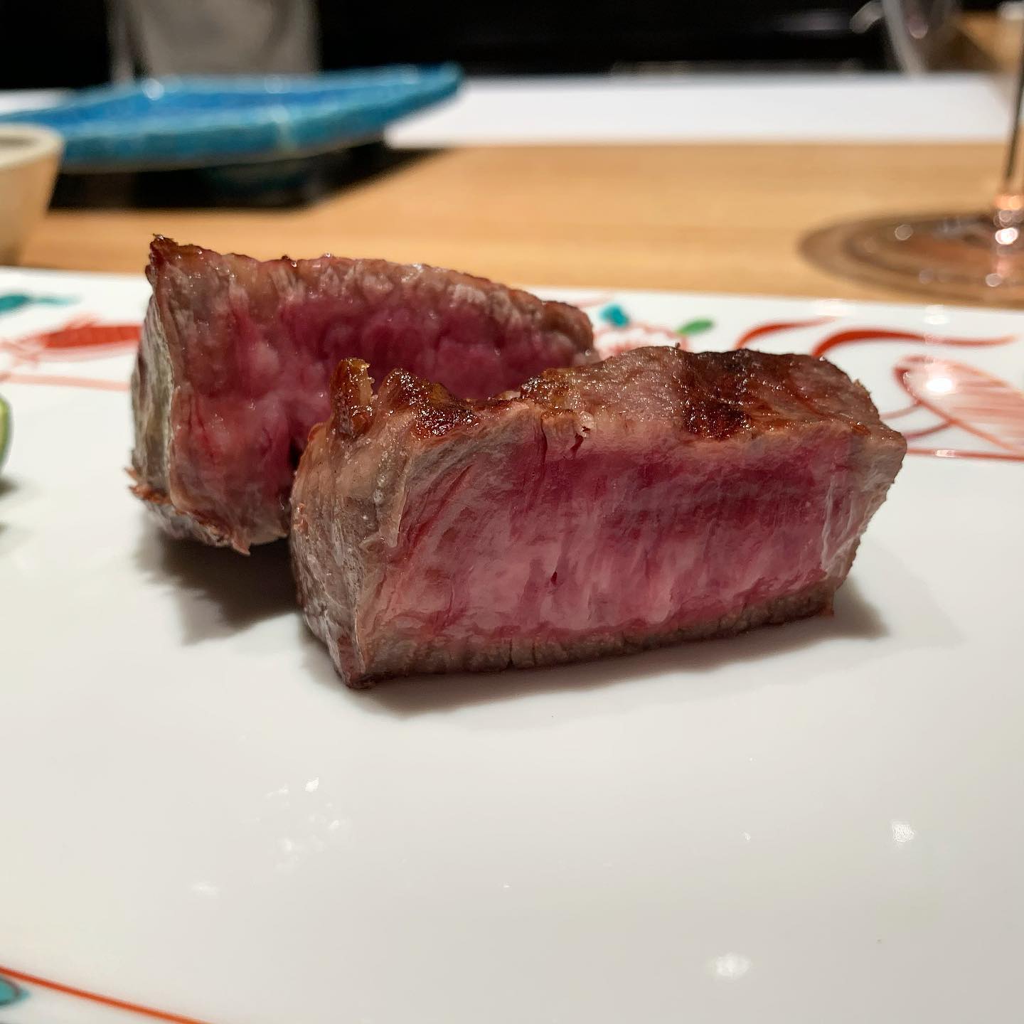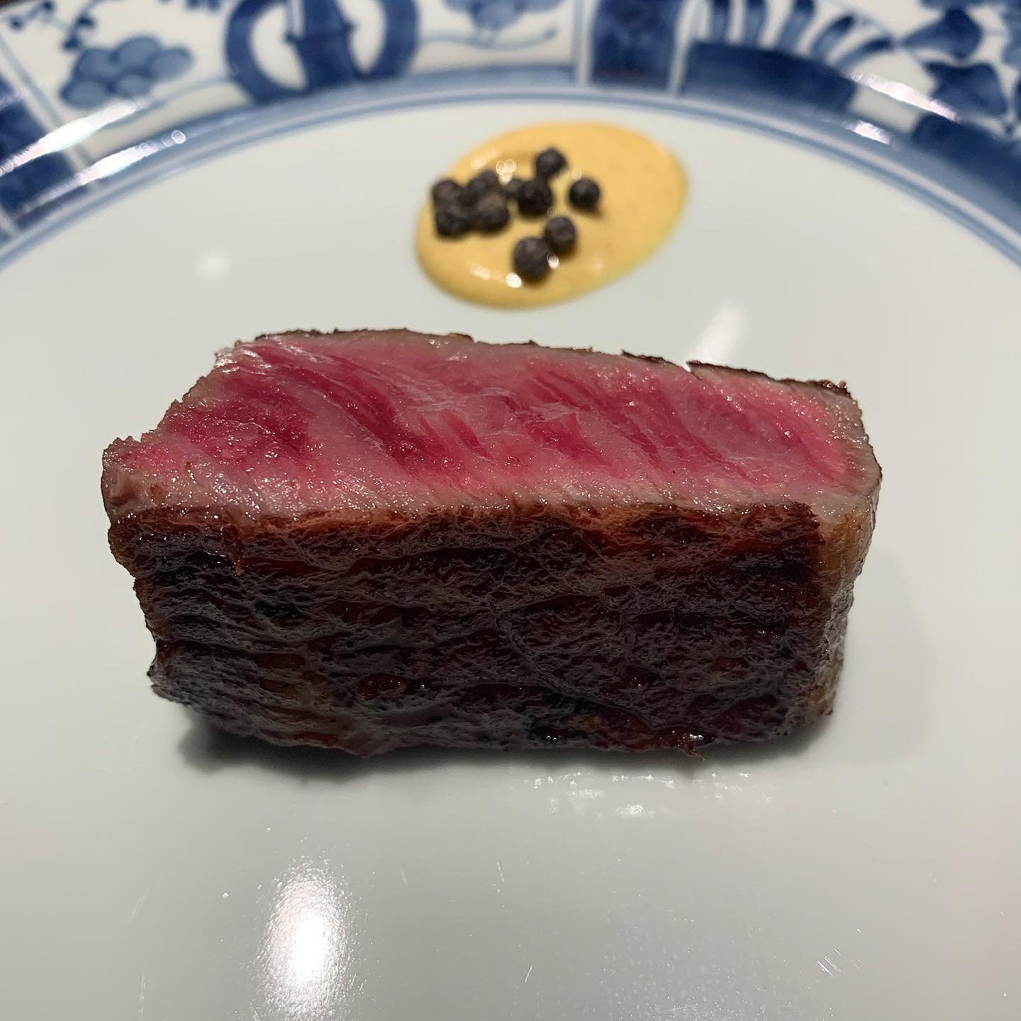◎肉割烹 岡田前(麻布十番)◎ *麻布十番駅から徒歩5分 *肉好きには堪らない絶品お肉料理のオンパレード *食べログ3.06 *おまかせコース:18,000円  ペアリング(途中ストップ):8,000円 肉のコースは普段あんまり行かないが、いざ岡田前へ。 21年2月にオープンしたが、グルメの人達や The Innocent Carvery時代からのファンで満席。 岡田さんが軽快に捌くこだわり抜いたお肉を これでもかというほど堪能できるコース。 ソムリエもいるのでお酒好きはペアリングがオススメ。 ①神戸牛ヒレ刺しのカルパッチョ 春野菜とヒレ刺しの組み合わせ。紫蘇と山椒の香りが良い。 お肉は目立たないが美味しかった。 ②コンソメフランいくらのせ 松茸出汁をしっかり感じるコンソメフラン。 いくらとの相性も良い。 合わせるのはスペインのロゼ。 ③メンチカツ雲丹のせ 肉肉しいメンチカツに濃厚雲丹がめちゃくちゃ合う。 雲丹は根室の馬糞雲丹。 肉割烹でここまで美味しい雲丹が食べれるとは。 合わせるのはニュージーのソーヴィニヨン。 ④牛タン刺し黒トリュフのせ 朝捌いた熊本の牛タンのタン中を刺しで。 贅沢にフランス産黒トリュフといただきました。 とにかく食感が抜群。新鮮さに驚いた。 合わせるのはカリフォルニアのシャルドネ。 ⑤牛ヒレのスープ アワビ、フカヒレ、京都の筍も入ったスープに 花山椒を添えた香りも風味も食感も楽しめる1品。 ⑥松阪牛ミンチのTKGキャビアのせ 松阪牛のイチボを生のままミンチにしてTKGと キャビアと合わせていただく。 最初から混ぜて食べたが、まずは混ぜずに食べれば良かった。 合わせるのはフランスロワールのロゼスパークリング。 ⑦タンステーキ(熊本) ここからがメイン。捌きたてのタン元のステーキ。 とにかく食感が秀逸。さっぱり塩と酢橘でいただきました。 合わせるのはニュージーのピノ・ノワール。 この辺で酔ってきたのでワインはストップ。 ⑧内腿のステーキ(松坂牛) きめ細かいお肉でしつこさがない。 ジューシーさがガーリックや山葵と良い相性。 ⑨サーロインのステーキ(神戸牛) しっかり脂の乗ったサーロインはフレンチマスタードと カンボジアの生胡椒でいただきました。 美味しかったが少しこの辺からキツくなってしまった。 ⑩シャトーブリアンのカツレツ(神戸牛) メインラストはカツレツ。 薄衣でステーキがきつくなってきた時の良い変化だった。 ⑪蕎麦 さっぱり蕎麦で〆。お腹がキツくてもペロリと完食。 ⑫トリュフのアイスとイチゴのケーキ トリュフのアイスの香りがめちゃくちゃ良かった。 トリュフとバニラアイスの相性がこんなに良いとは。 どの料理もとても美味しかったが、最後の方は 少しきつくなってしまった。 改めて肉より魚の方が満足度は高いと思った。 もちろん肉好きには堪らない内容だと思うので肉好きは是非。 ★★★★★★★☆☆☆