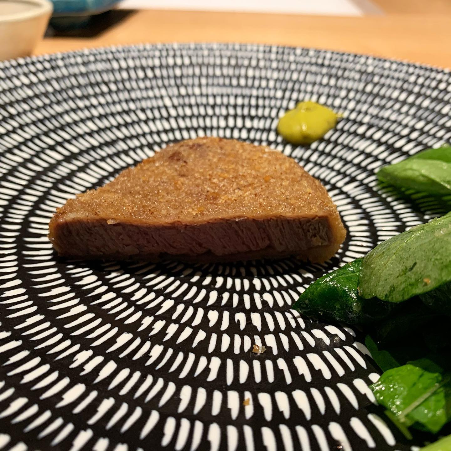 ◎肉割烹 岡田前(麻布十番)◎ *麻布十番駅から徒歩5分 *肉好きには堪らない絶品お肉料理のオンパレード *食べログ3.06 *おまかせコース:18,000円  ペアリング(途中ストップ):8,000円 肉のコースは普段あんまり行かないが、いざ岡田前へ。 21年2月にオープンしたが、グルメの人達や The Innocent Carvery時代からのファンで満席。 岡田さんが軽快に捌くこだわり抜いたお肉を これでもかというほど堪能できるコース。 ソムリエもいるのでお酒好きはペアリングがオススメ。 ①神戸牛ヒレ刺しのカルパッチョ 春野菜とヒレ刺しの組み合わせ。紫蘇と山椒の香りが良い。 お肉は目立たないが美味しかった。 ②コンソメフランいくらのせ 松茸出汁をしっかり感じるコンソメフラン。 いくらとの相性も良い。 合わせるのはスペインのロゼ。 ③メンチカツ雲丹のせ 肉肉しいメンチカツに濃厚雲丹がめちゃくちゃ合う。 雲丹は根室の馬糞雲丹。 肉割烹でここまで美味しい雲丹が食べれるとは。 合わせるのはニュージーのソーヴィニヨン。 ④牛タン刺し黒トリュフのせ 朝捌いた熊本の牛タンのタン中を刺しで。 贅沢にフランス産黒トリュフといただきました。