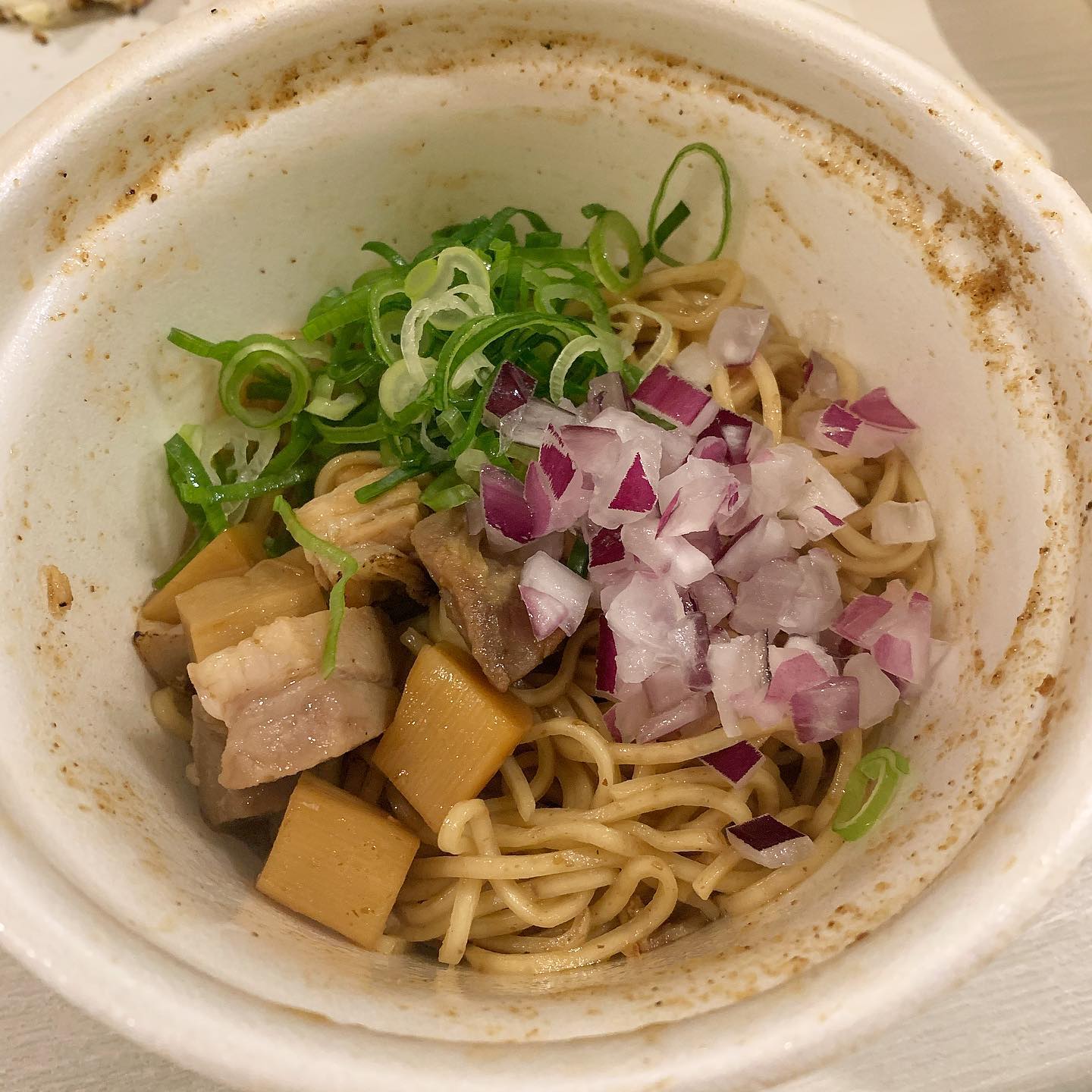 太麺の海老まぜそばの次は細麺ののどぐろ和えそばをテイクアウト。全粒粉入りの細麺はシコシコしていて歯切れのいいカネジン食品の特注麺。のどぐろ独特の味わいはあるが、店舗で食べるラーメンより醤油ダレの輪郭が強め。食べ終わった後に追い飯+温泉玉子。これまた絶品。最後まで美味しくいただきました。