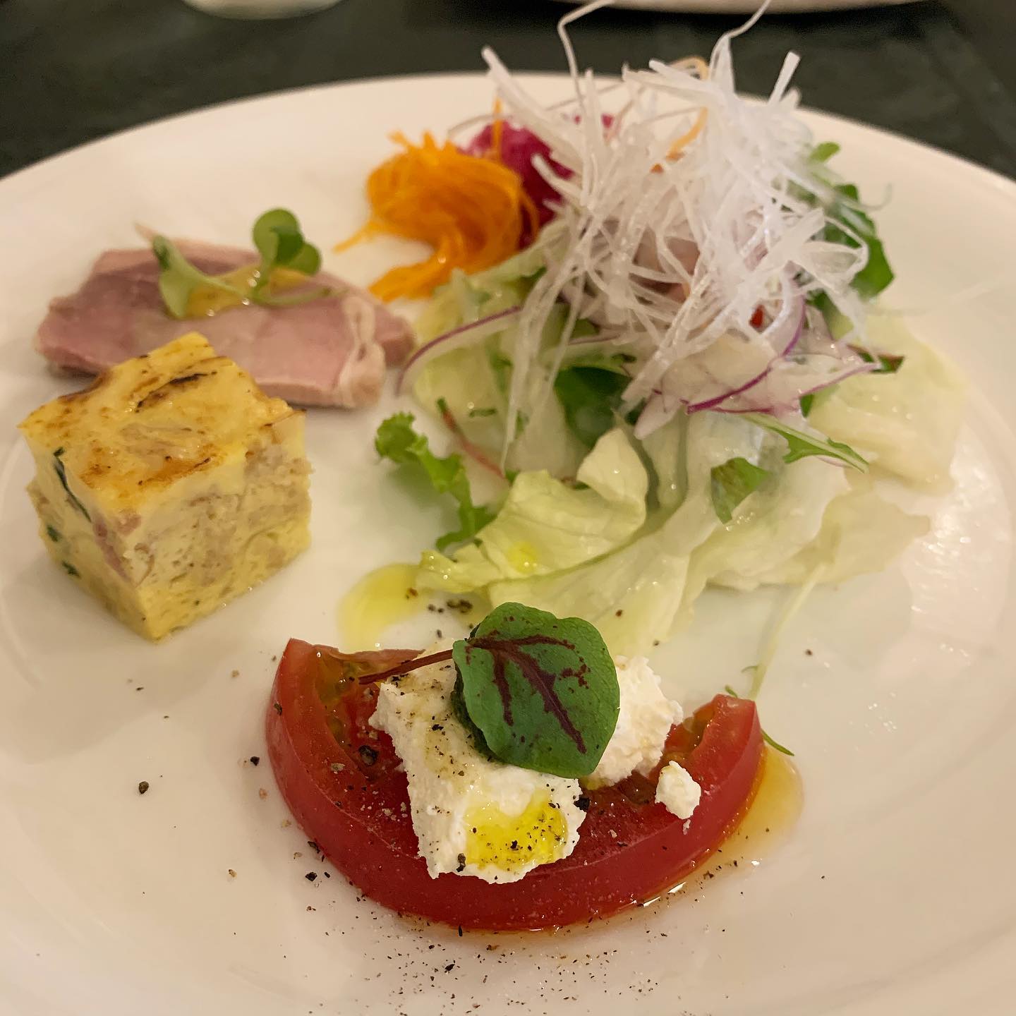 カプレーゼは完熟した若松トマトと濃厚チーズの組み合わせ。キッシュはできたてで温かくてふわふわ。自家製ハムは脂身のない肉でマスタードソースとの相性が良かった。