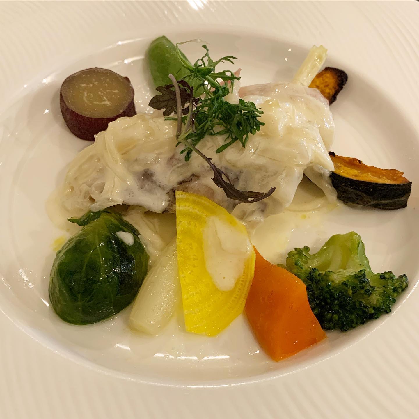 だるま鯛の赤ワイン蒸し新玉ねぎのソース。だるま鯛は淡白な白身。新玉ねぎの甘みが口に拡がるホワイトソースがとても美味しかった。付け合せは珍しい野菜も多く美味しかった。