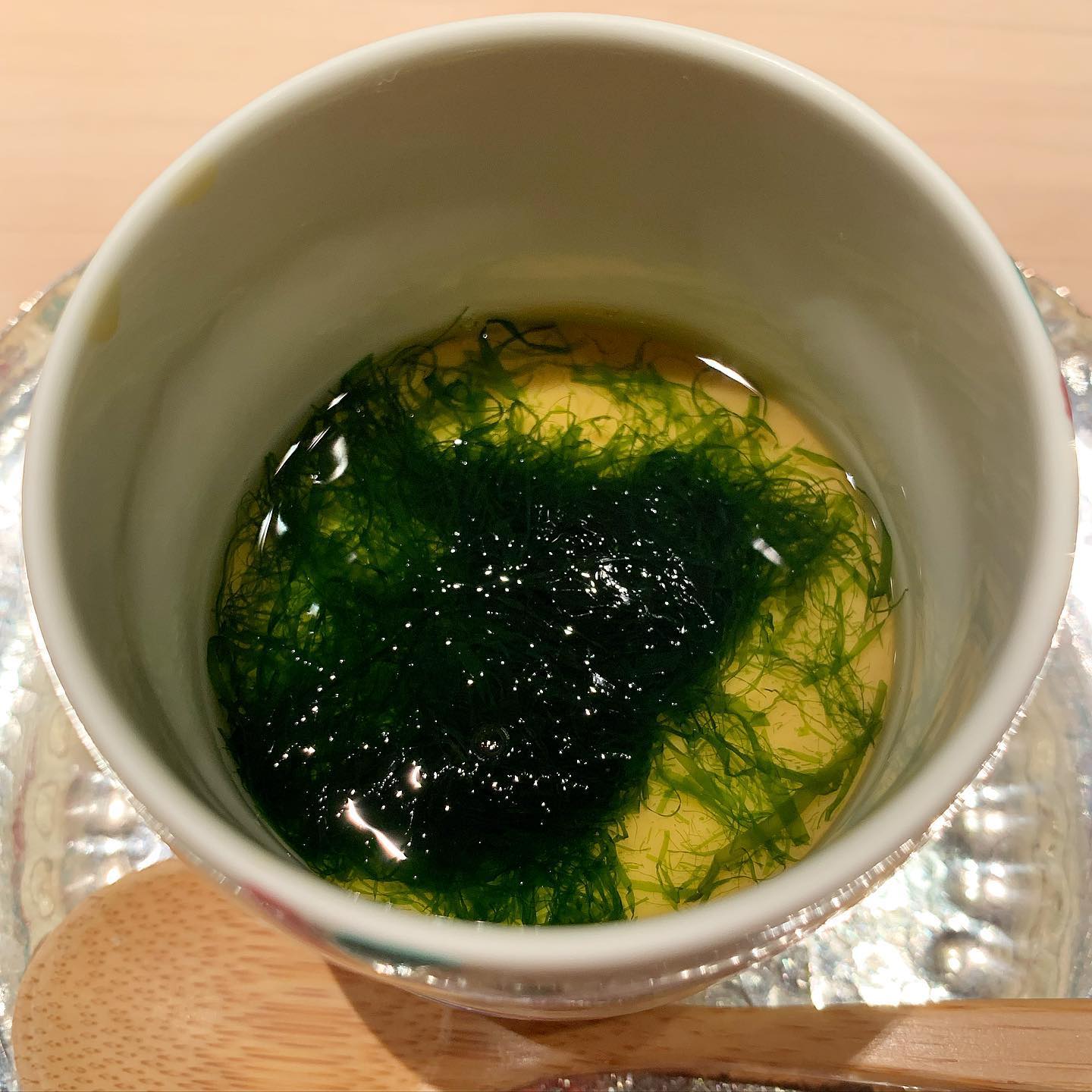 味付けは塩だけで、出汁の風味とアオサの香りを十二分に楽しむ。中にはイカが隠れていました。