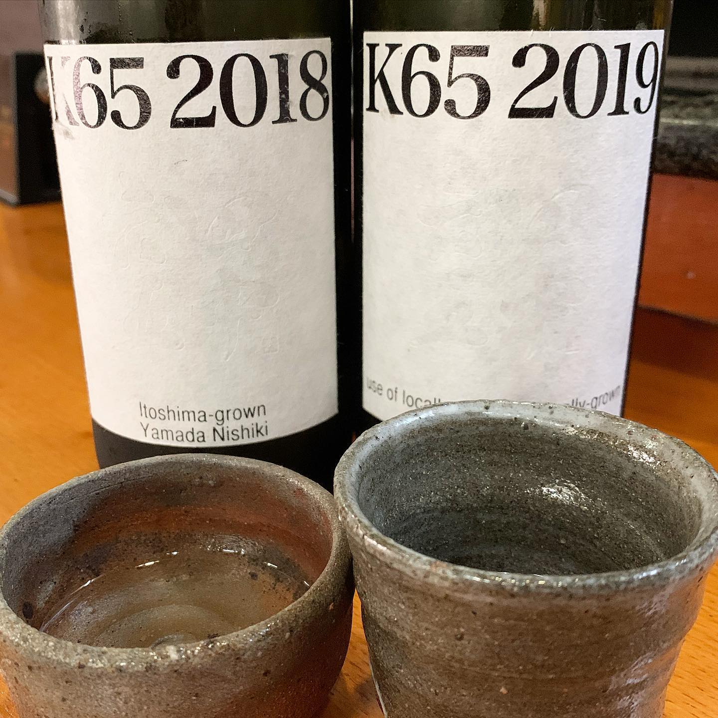 K65の飲み比べ。ラベルと同じくシンプルな味わい。2018の方が角が取れていて、丸みがある。山田錦100%。