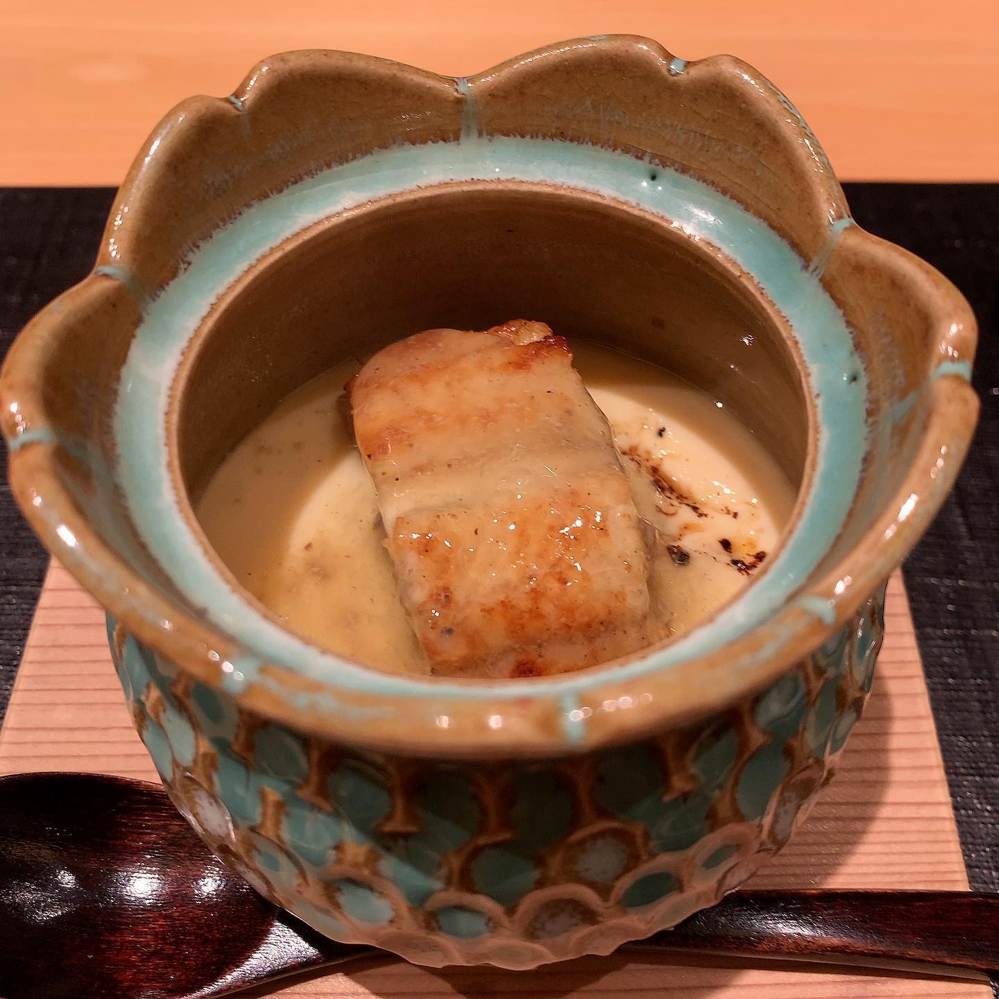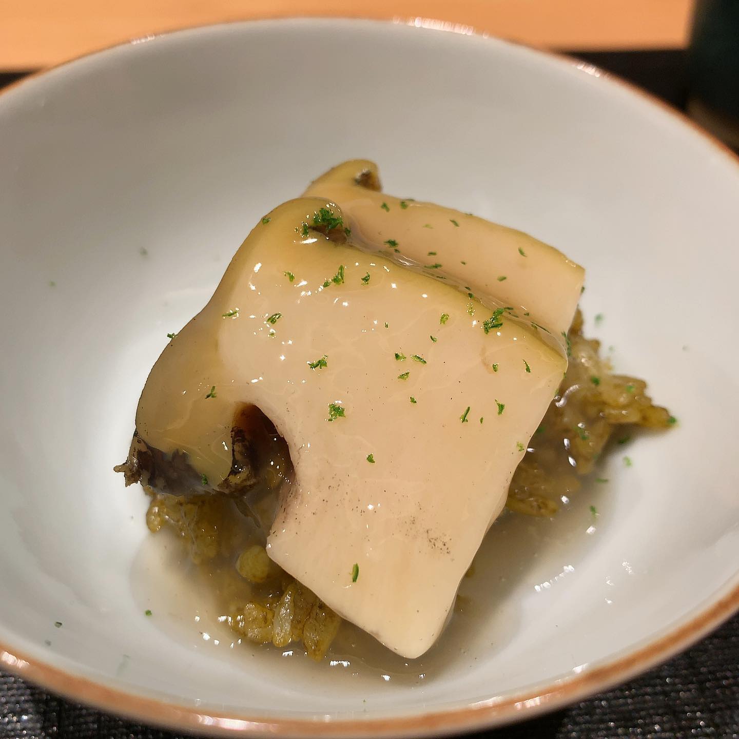 大阪の丸ナスに萩の赤雲丹。面白い組み合わせだが、抜群に美味しい。最高級な赤雲丹が盛り沢山。茄子は時間をかけてゆっくり素揚げし、出汁と合わせている。