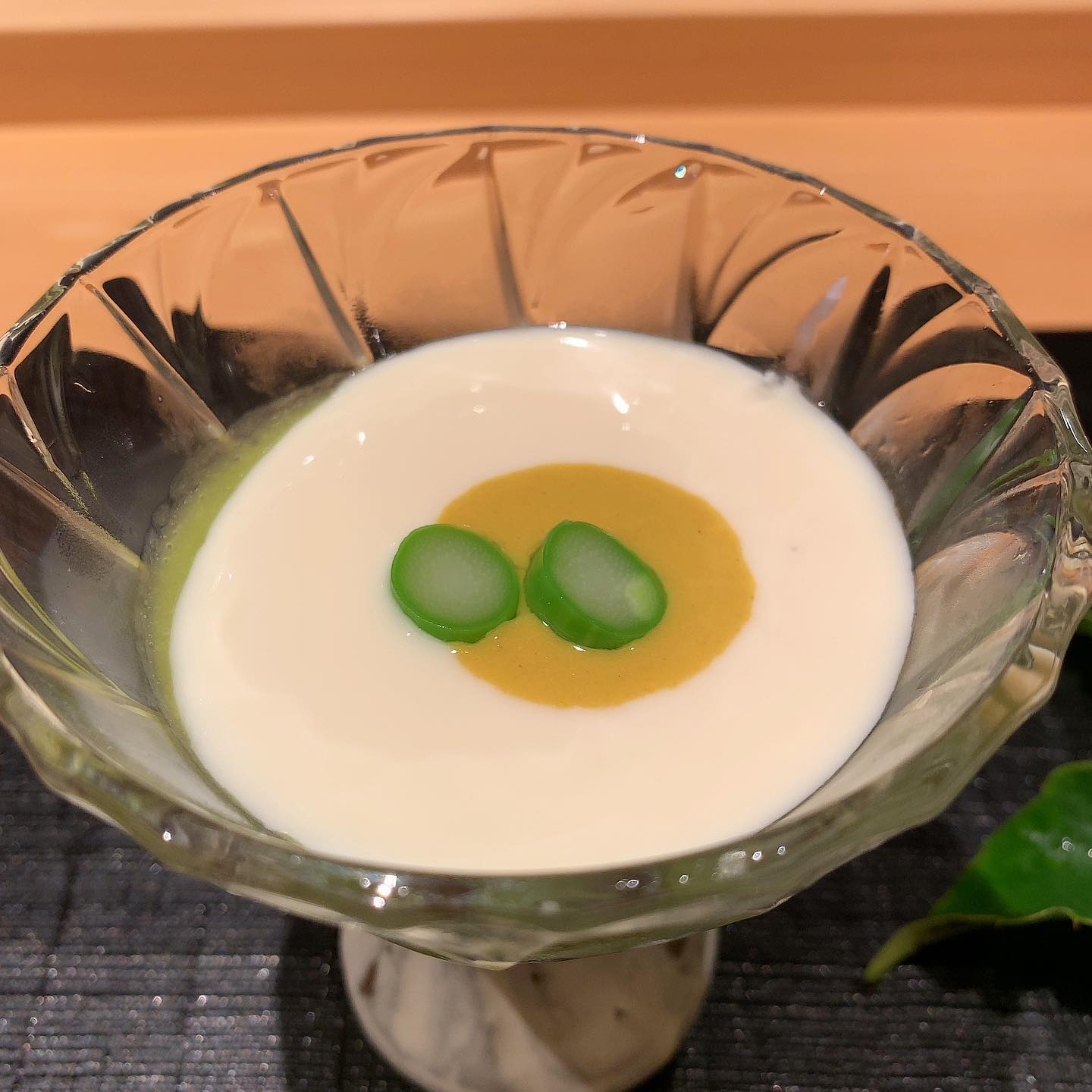 若松の夏アスパラを冷製スープに。糸島の豆乳を白味噌で仕立てた白いスープとときからして仕上げている。