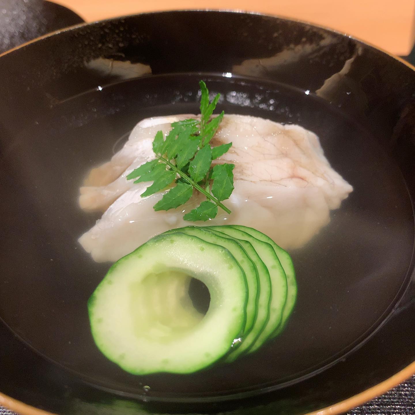 高級魚のコチを夏らしく胡瓜と一緒にお椀に。味に深みがあるマグロ節の出汁に、プリップリなこちを合わせている。