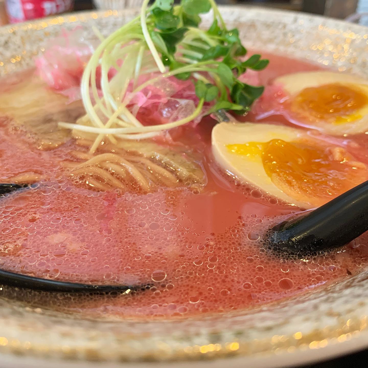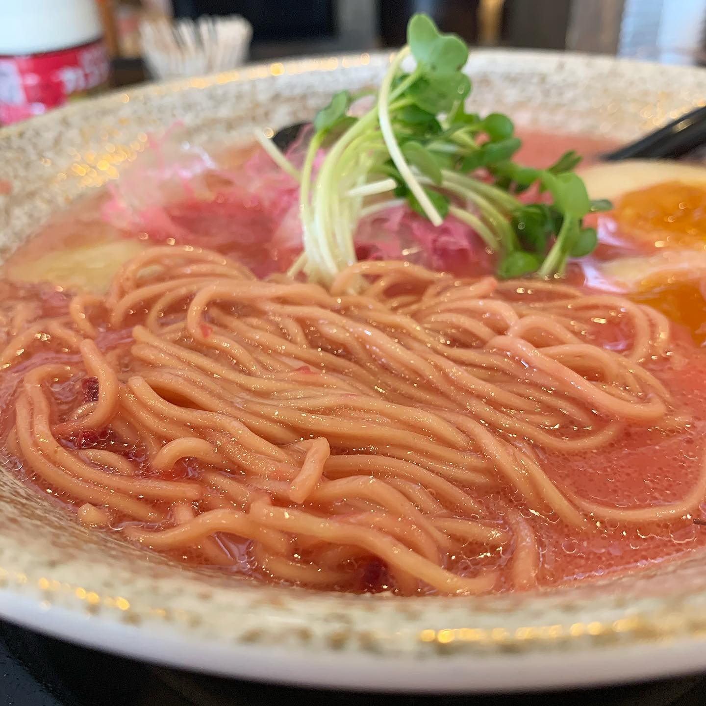 千代ケ崎のろくの家。今回は限定の桃色らーめんを注文。ピンク色の正体はビーツ。豚骨ベースのスープはビーツ特有の甘みをほのかに感じて、野菜から出汁を取ったような丸みのある感じ。国産全粒粉を使用した細麺は舌触りがよくスープともよく絡む。トッピングでは珍しい削りかまぼこはしなしなした食感で麺との相性抜群だった。細部にこだわりを感じる1杯。土曜のお昼に訪問したら、待ちが出るほど賑わっていました。
