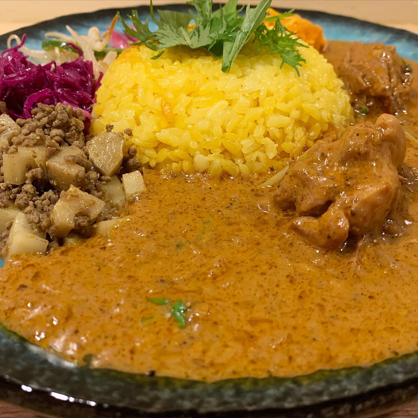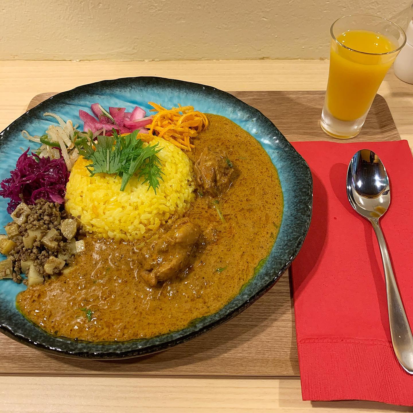 20年5月に旦過市場でオープンしたカレー屋さん。ココナッツベースのカレーはスパイスが効いているが、まろやかでコクがあり、とても複雑で濃厚な味わい。辛さは控えめ。サブジはミンチ肉とレンコン。アチャールは紫キャベツ、モヤシとピーマンの炒め、玉ねぎの酢漬け、人参の胡麻和え。途中から混ぜて食べると酸味もプラスされてこれまた旨い。食後のマンゴージュースも濃厚で美味しい。大満足でした。