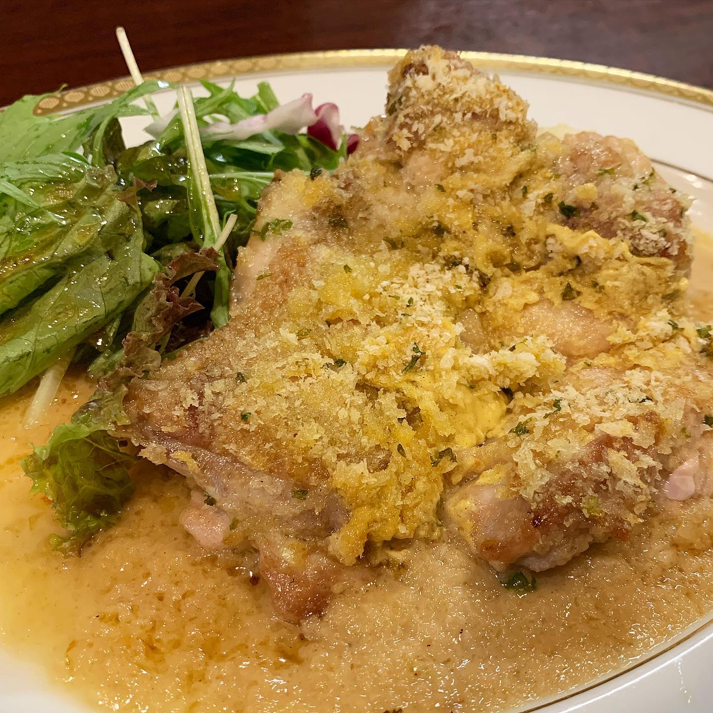 旦過市場近くのカジュアルフレンチでランチ。No.1ランチメニューの「若鶏の香草パン粉焼き」を注文。若鶏はジュージューで柔らかく、オニオンジャポネソースと相性バッチリ。ソースの存在感が強いが、若鶏も負けていない。パン粉のサクサク感はあんまりないが、マスタードのアクセントや香草の香りで奥深い味わいになり1番人気も頷ける1品だった。
