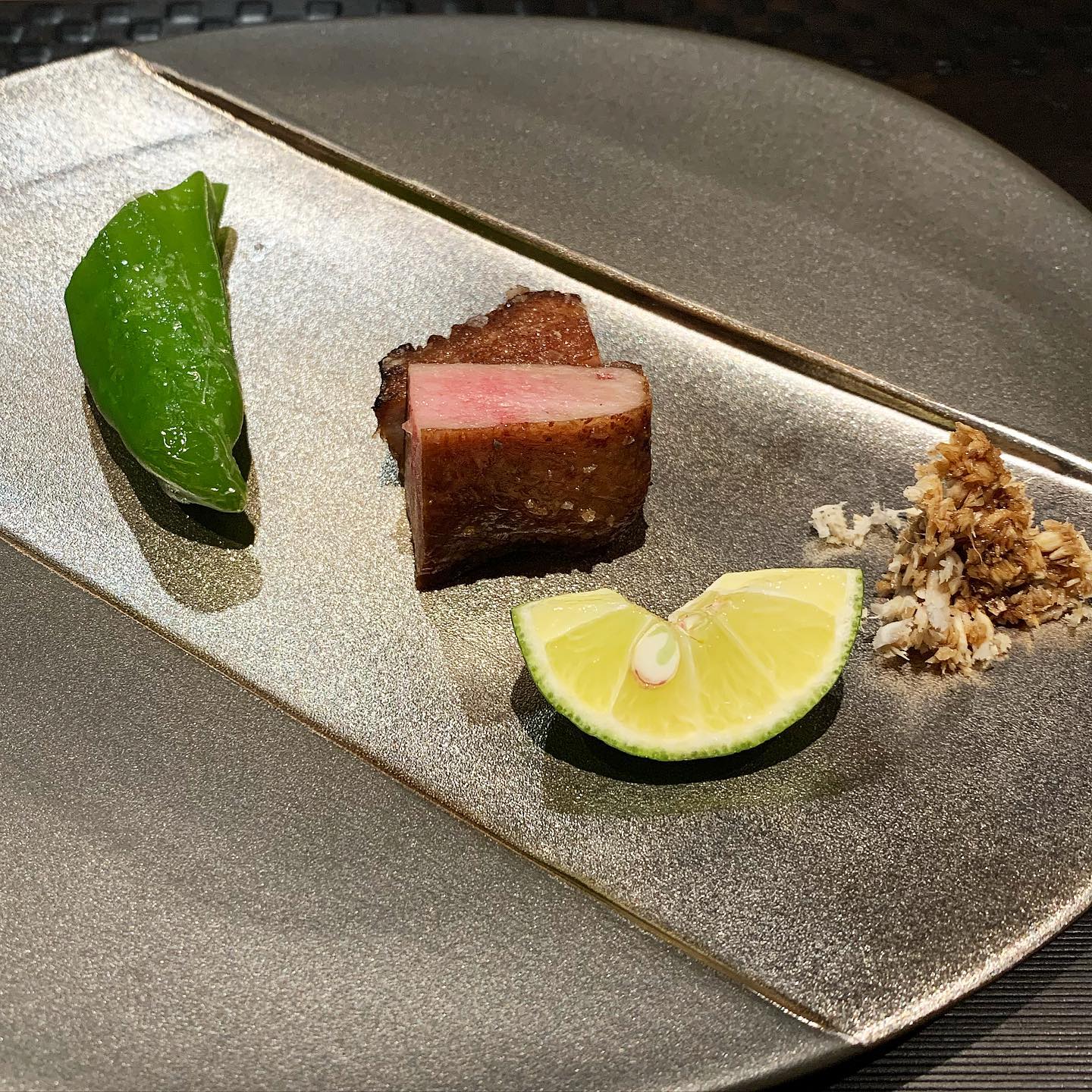 黒毛和牛の牛タン。柔らかくジューシーなので恐らくタン元。シンプルに塩のみの味付けが1番。付け合せは万願寺とうがらし。山わさび、酢橘はお好みで。