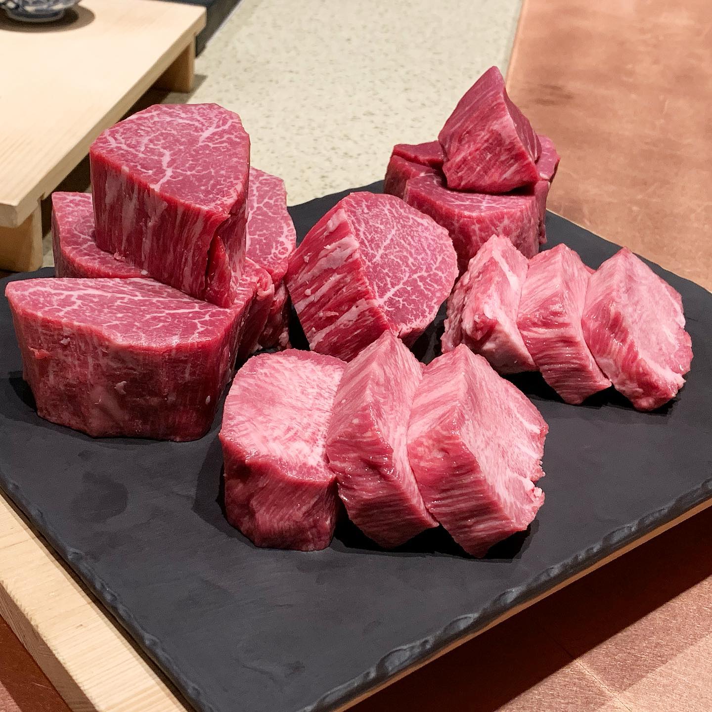 カブリの湯引き、巻きロース炙り、ランプのローストビーフの3種盛り。カブリはリブロースの希少部位。サシのキメが細かく柔らかい。ランプはトマトとベーコンのソースで赤身特有の肉の旨味とよく合う。