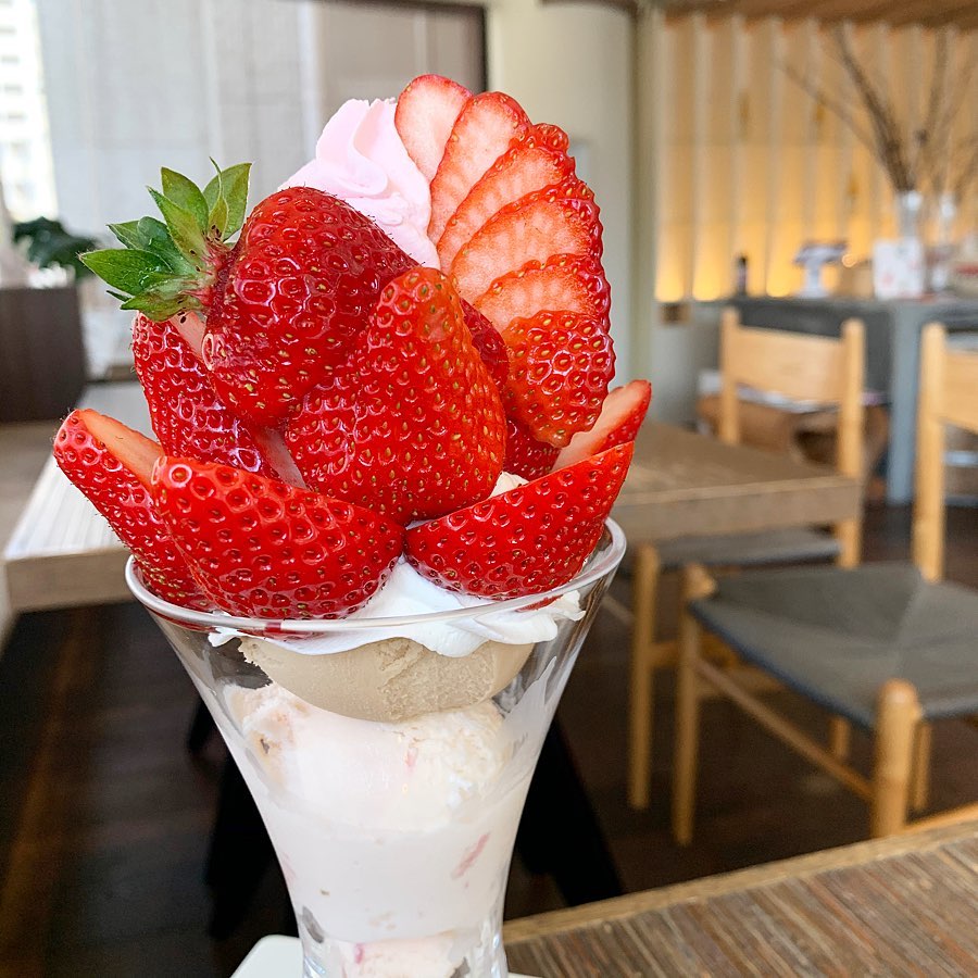 たまには甘い物投稿。フルーツパフェが有名なお店。今回は季節限定の徳島県佐那河内村のさくらももいちごのパフェを注文。ジェラートはロイヤルミルクティーとさくら。ジューシーで爽やかな苺は甘さ控えめで、桜の生クリームの甘さとの相性抜群。