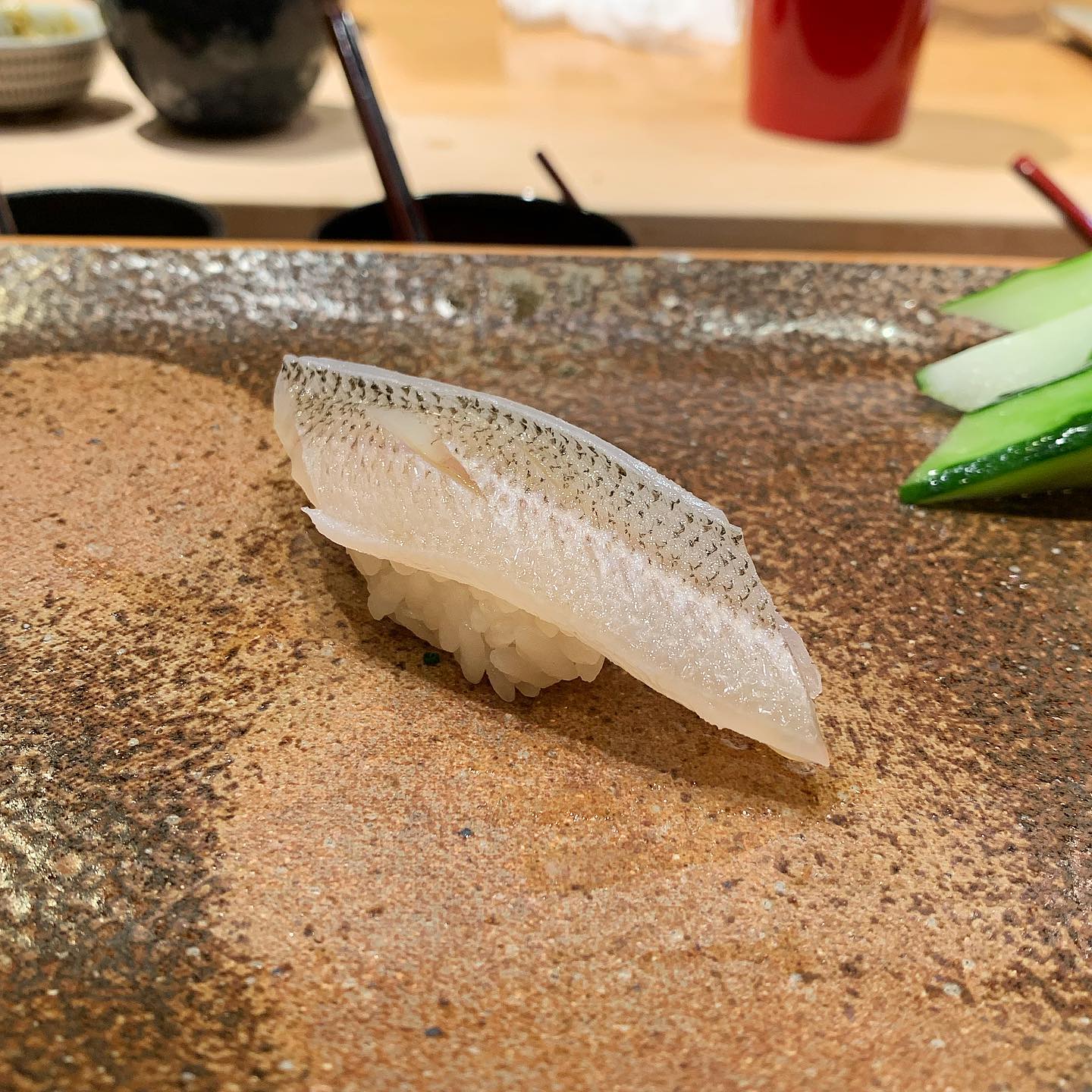 漬けの後はあっさり柚子胡椒だけでいただくきす。きすのお寿司は珍しいが美味しい。
