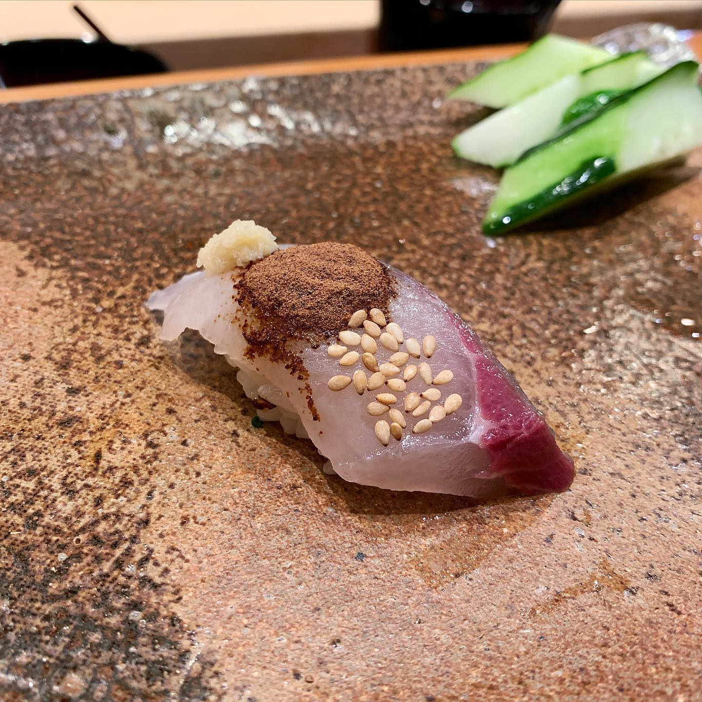 歯応えのある美味しいしまあじに粉醤油と生姜を合わせる。しまあじの濃い旨味を邪魔しない粉醤油の効き方に感動。