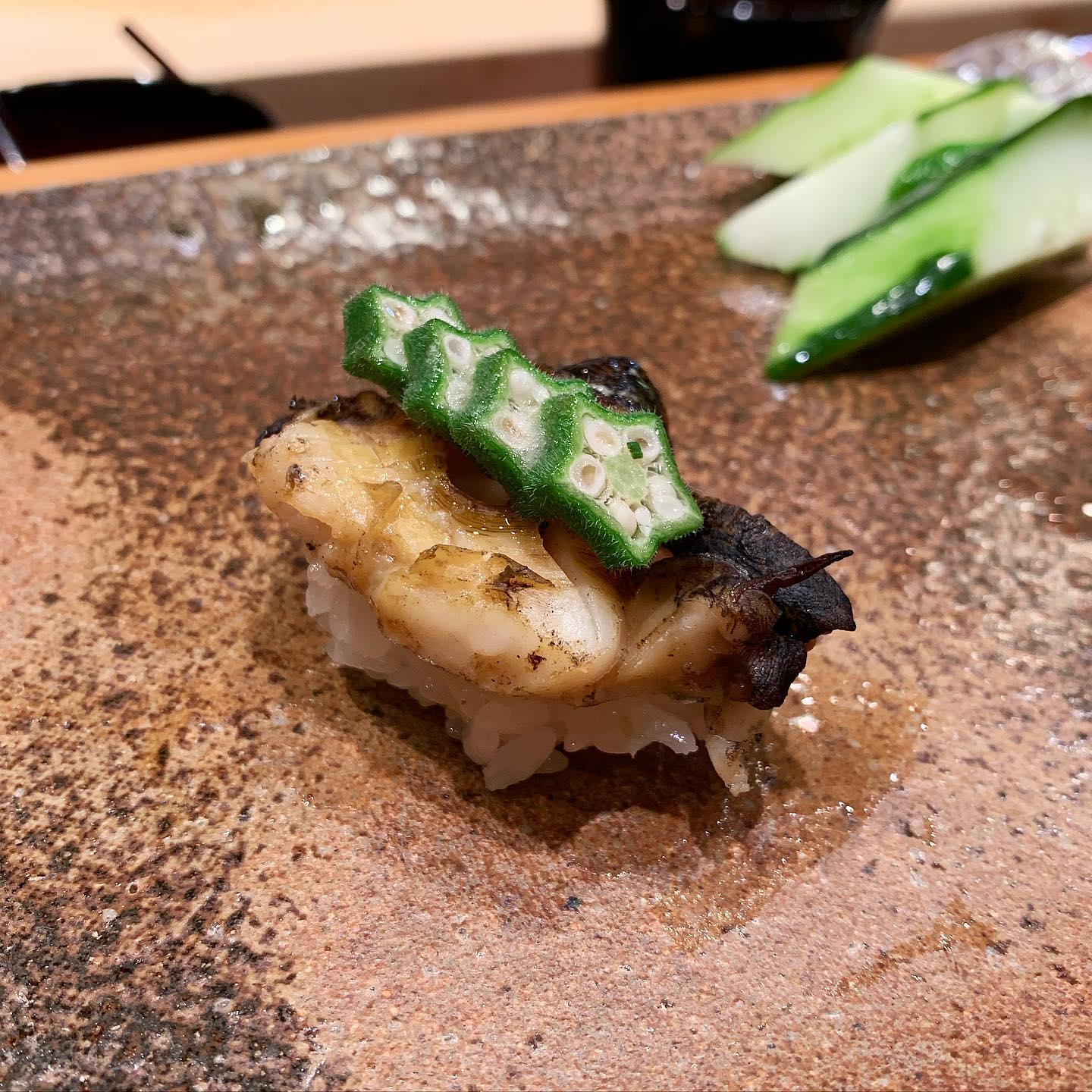 しっかり焼いたサザエにオクラのネバネバを合わせる。面白い組み合わせだがとてもよく合う。