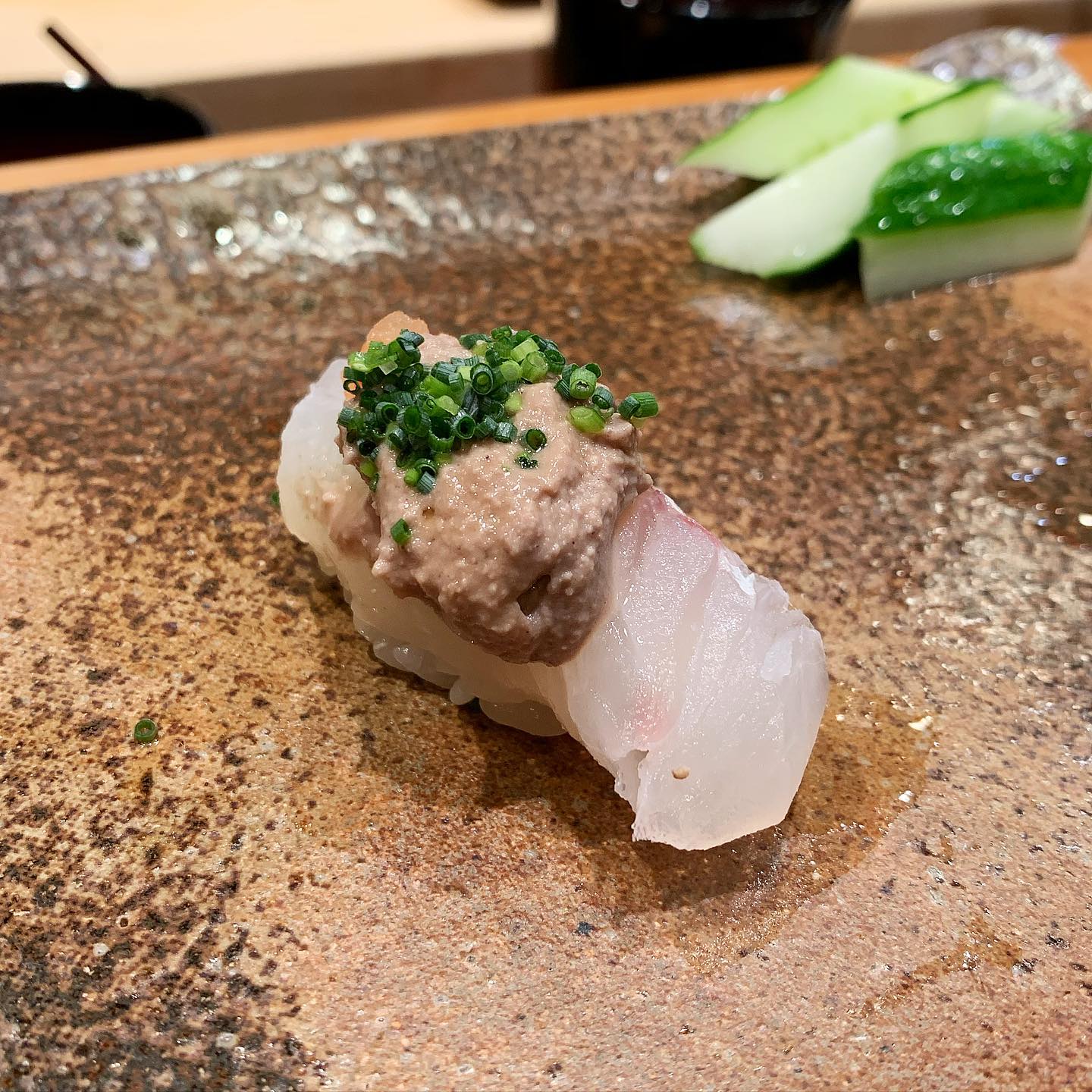 鯛に鯛の肝と浅葱を合わせる。肝を合わせるのは何とも小倉前らしい。口の中で混ざり合うとほんと絶品。