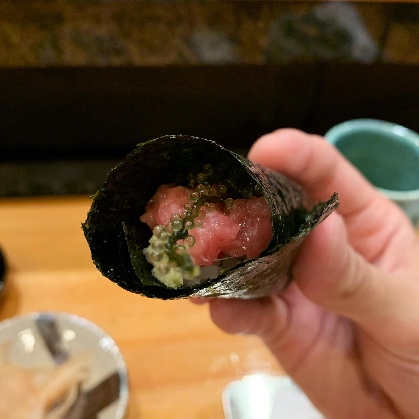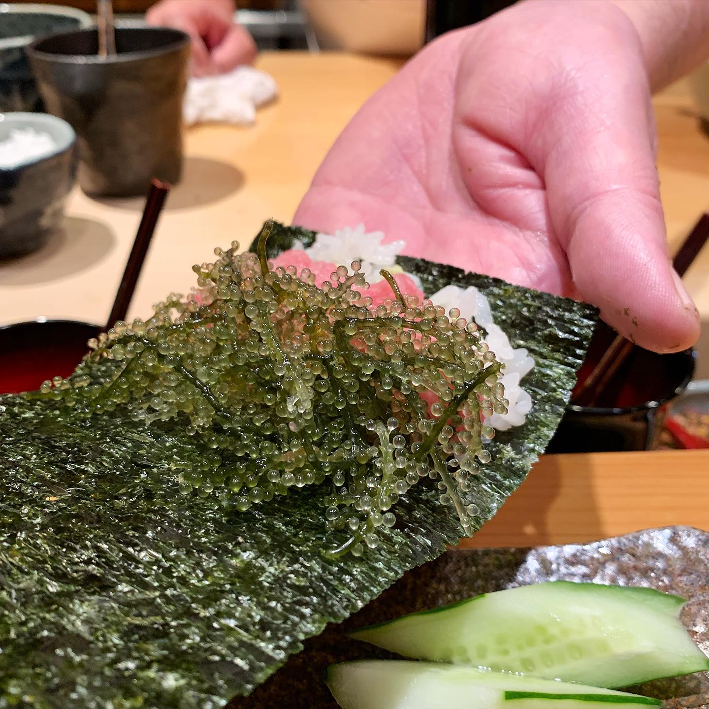 海ぶどうと合わせたねぎとろ巻き。海ぶどうの塩気がいい塩梅。この組み合わせもとても美味しい。