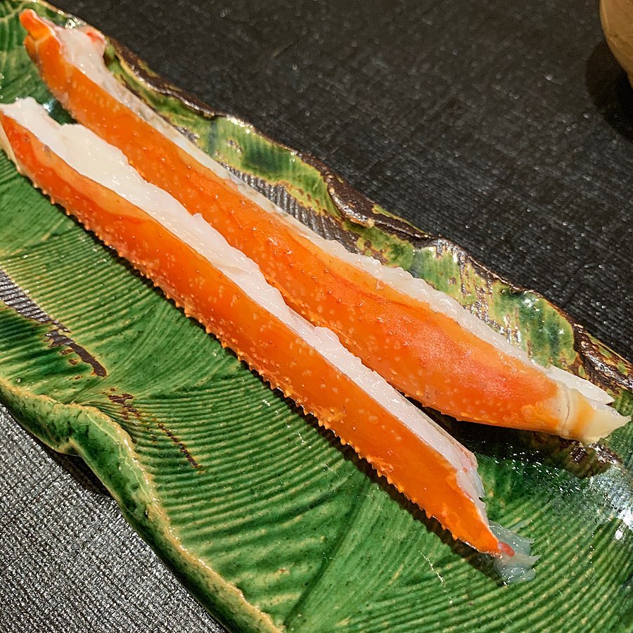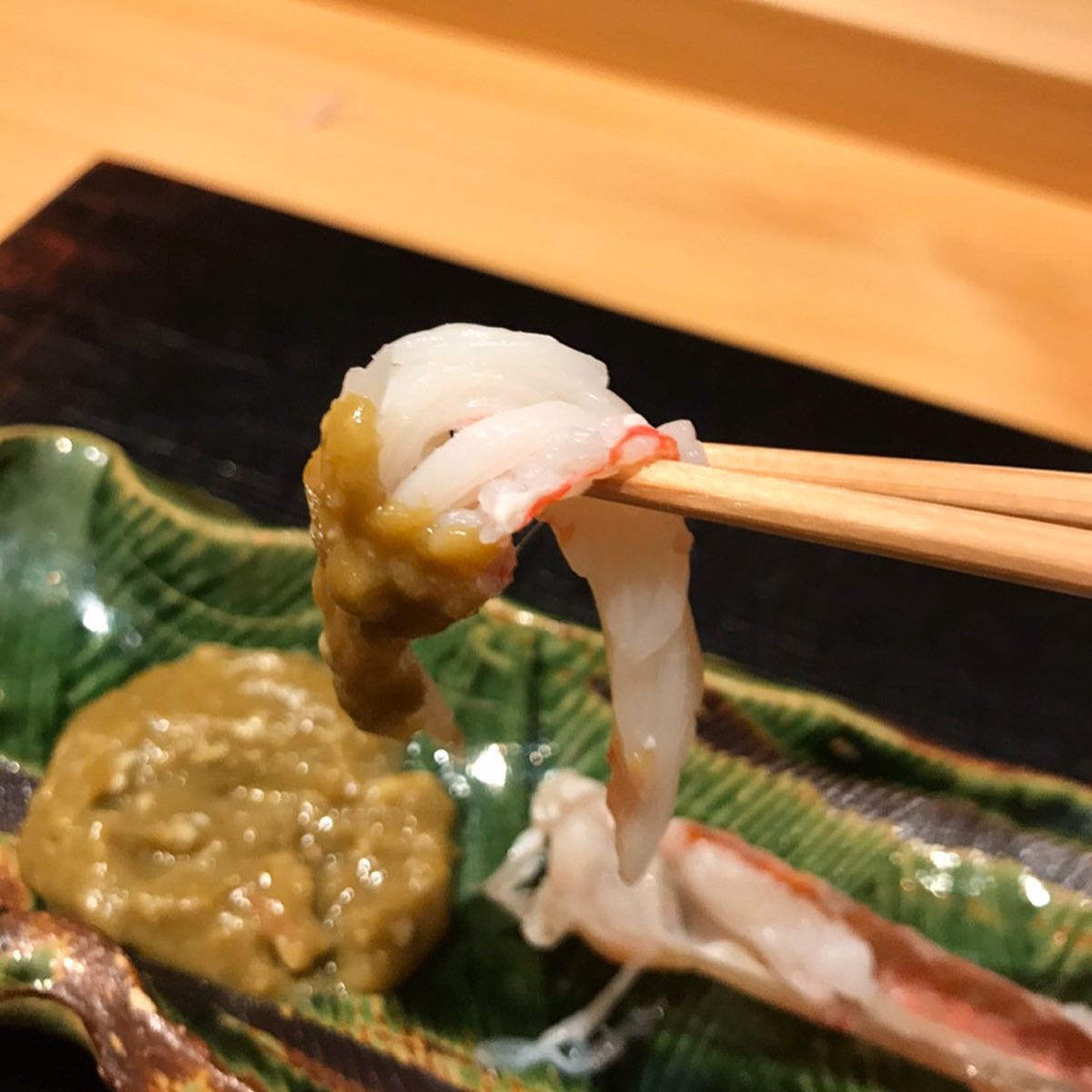 脚はハサミで慎重にカット、その後じっくり炭火で熱を入れ、絶妙な半生状態で提供。蟹の甘さが引き立ち美味すぎて鳥肌立ちました。