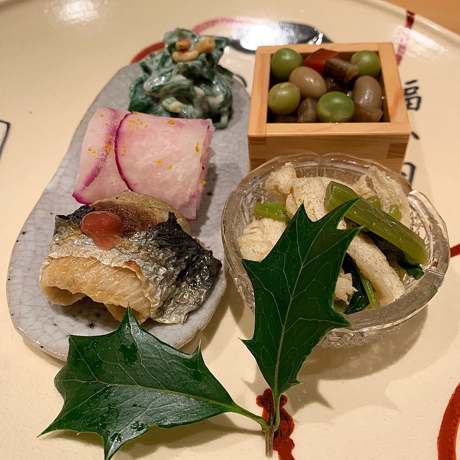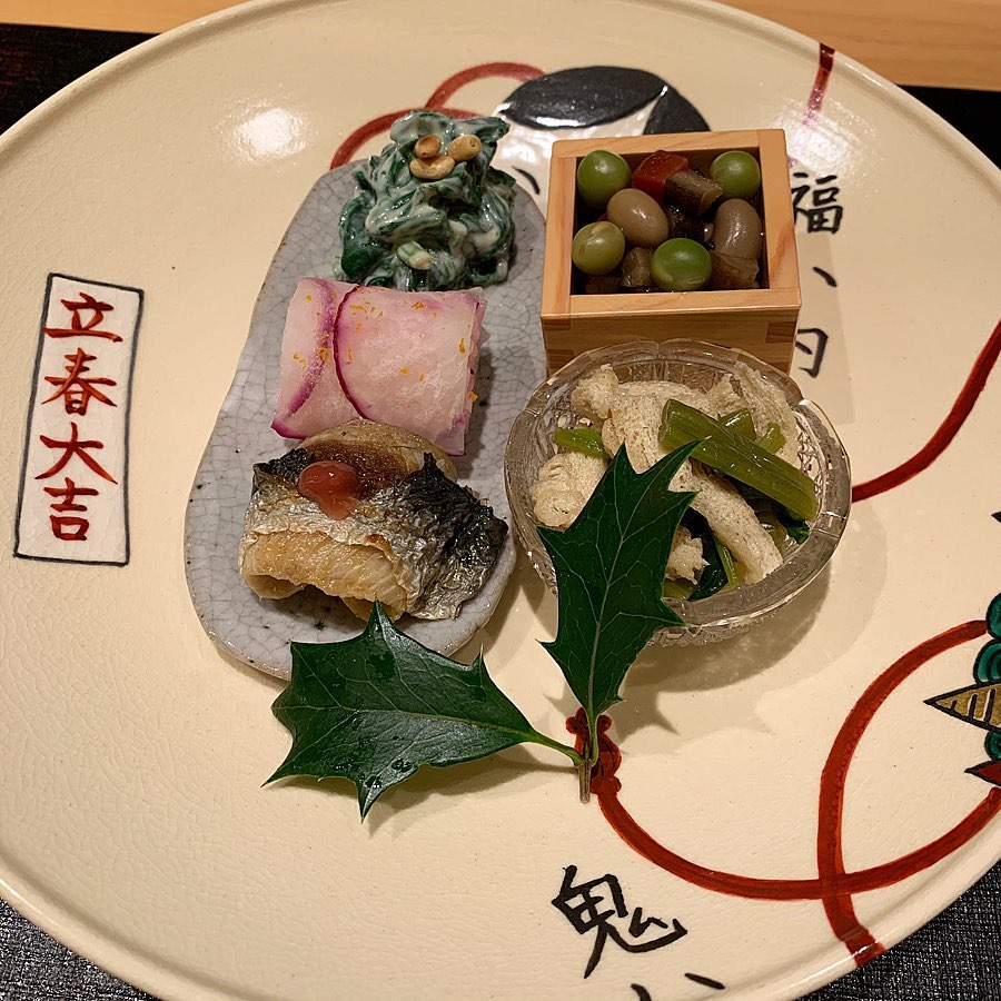 節分を意識した見た目も美しい八寸。5色豆、花わさび、北九州の大葉春菊、柊イワシなど様々な旬の食材を使用。