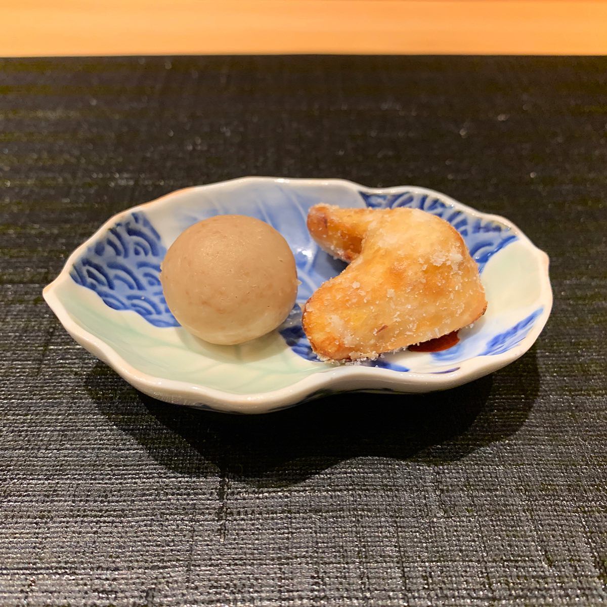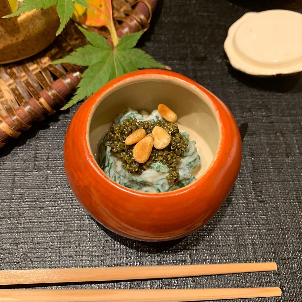 畑のキャビアと呼ばれているとんぶりと松の実乗せ。