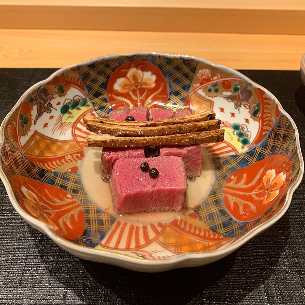 真空低温調理した後に、表面を炭火で焼いた一品。黒胡椒と素揚げした牛蒡と一緒にいただきました。美味すぎて悶絶。