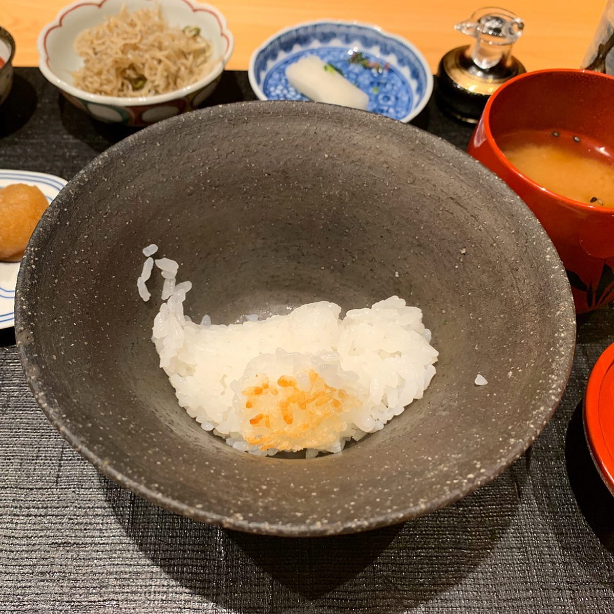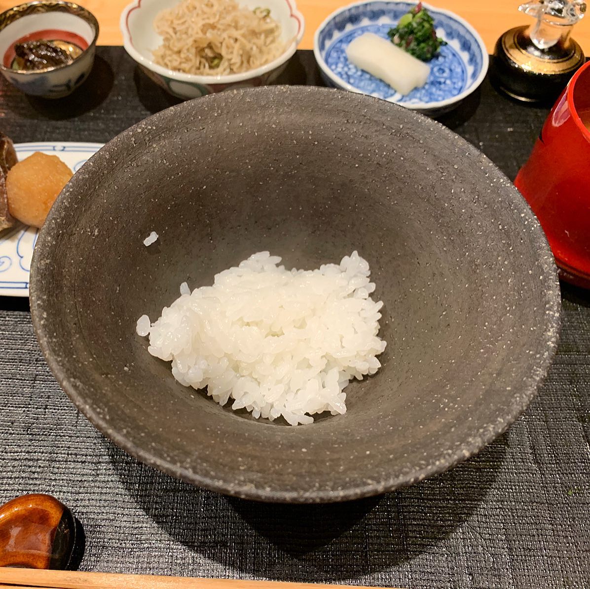 コシヒカリの新米。秋刀魚の炭焼き、ちりめん山椒、獅子唐の味噌和えなどと一緒にいただきました。2杯目以降はおこげ付き。