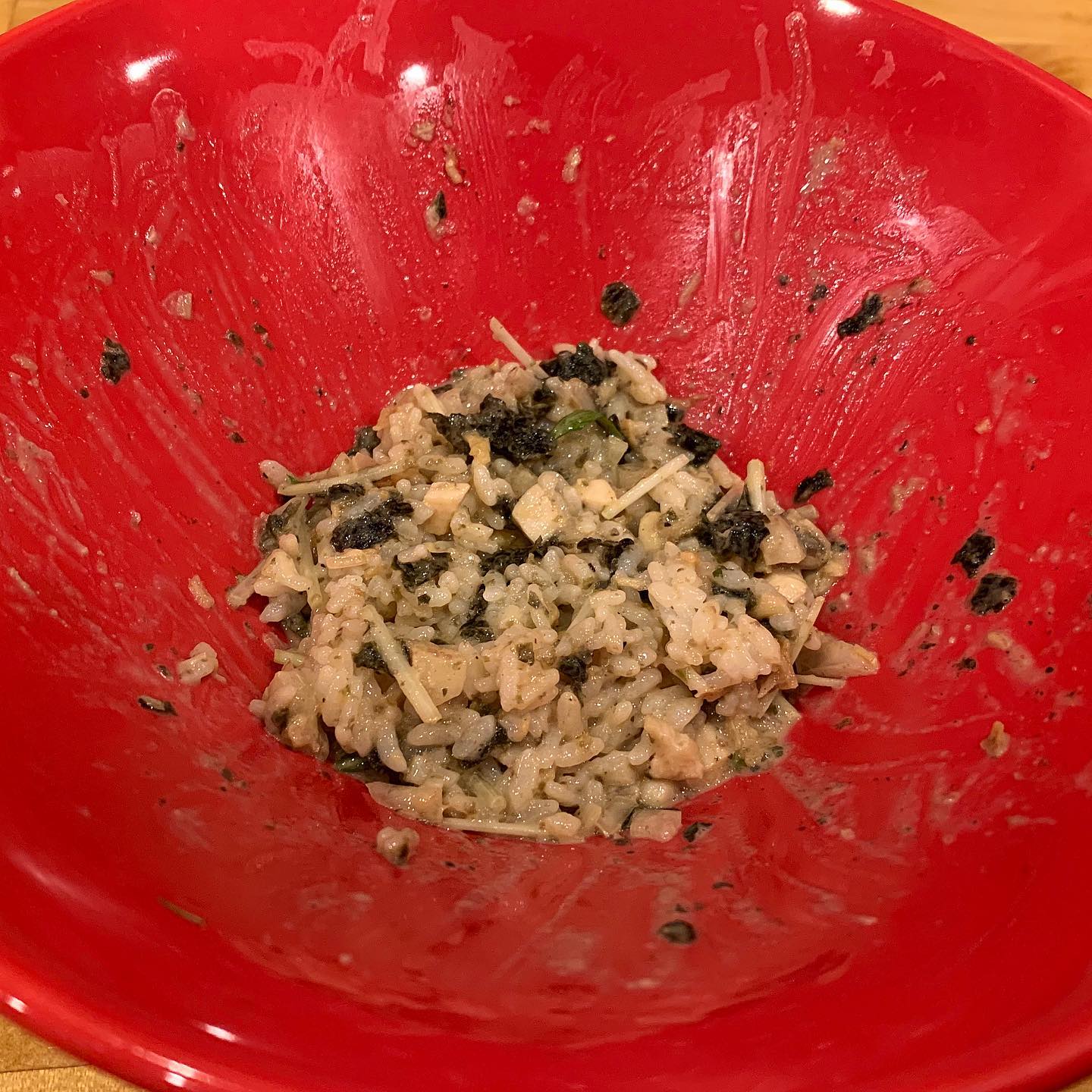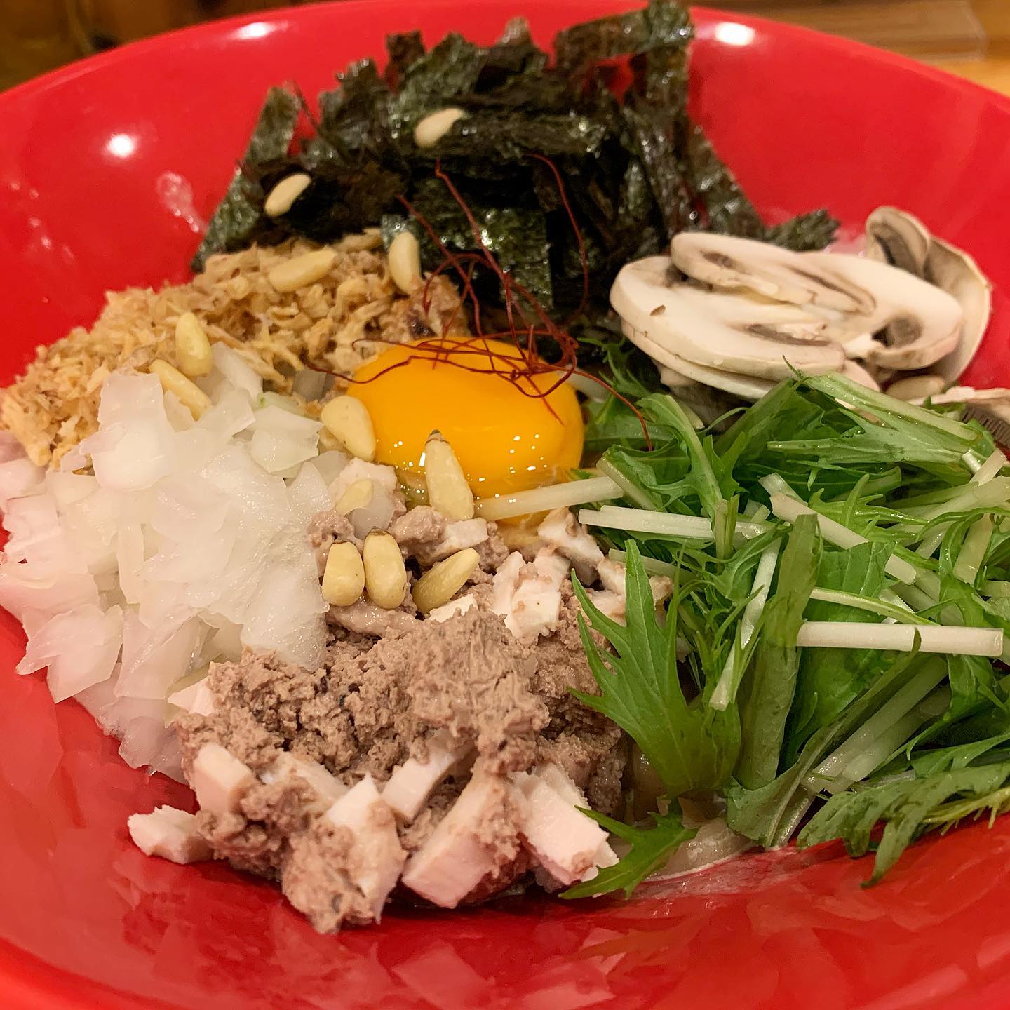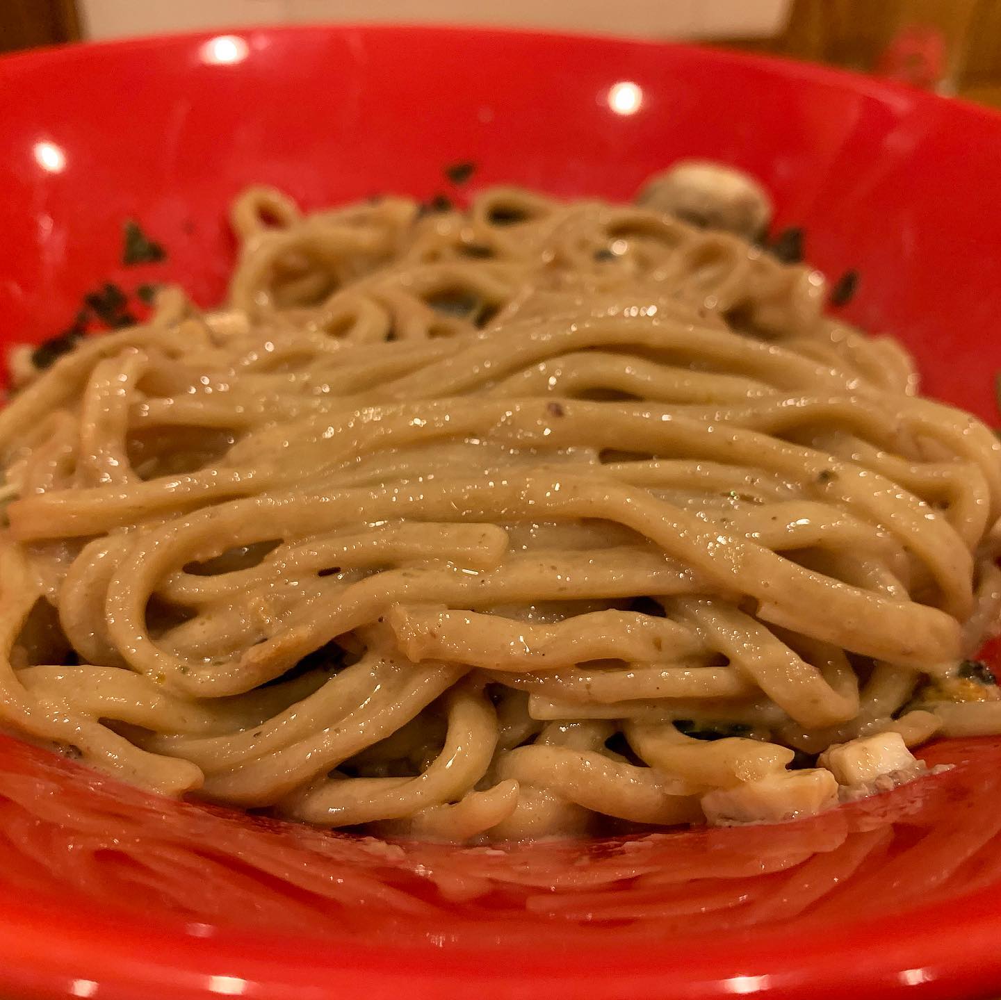 期間限定の「自家製レバーペーストとホワイトマッシュルームのまぜそば」を注文。北海道産小麦を使った自家製の太麺がレバーペーストに絡まって絶品。クリーミーな太麺パスタのような感じ。無料の追い飯で〆。限定では一番好きかも。