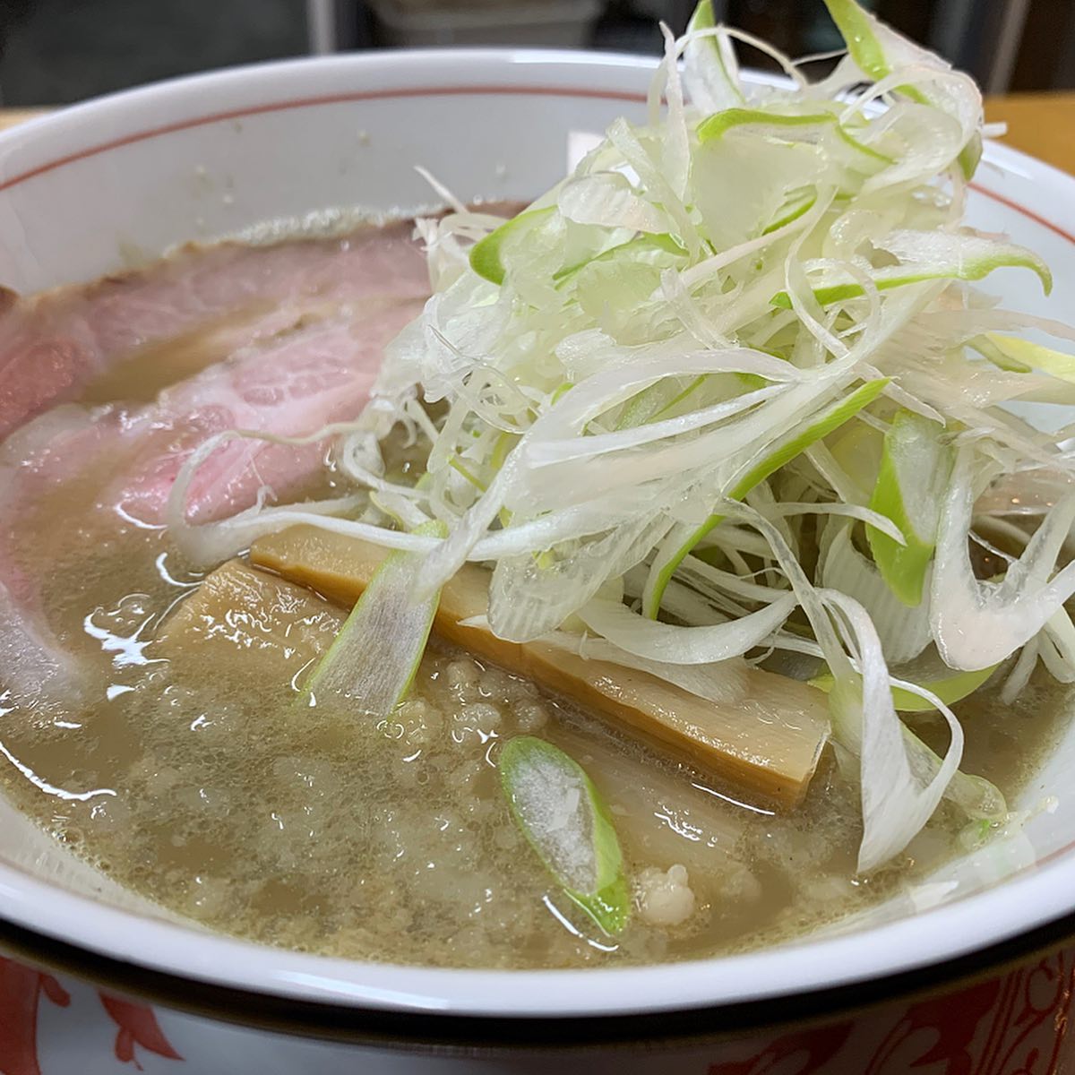 小倉に煮干しがあるということで早速来店し、こく煮干しを注文。濃ゆいのくるかと思いきや、セメント系とは呼べないほどあっさり目。麺は煮干しには珍しい全粒粉入りだが、コシが強めで予想に反してマッチしていた。周防大島産の煮干し100%で煮干しの旨みもしっかり感じられた。予想に反してなかなかの完成度!欲を言うとやっぱり煮干しには白髪ネギより玉ねぎが良いかな!