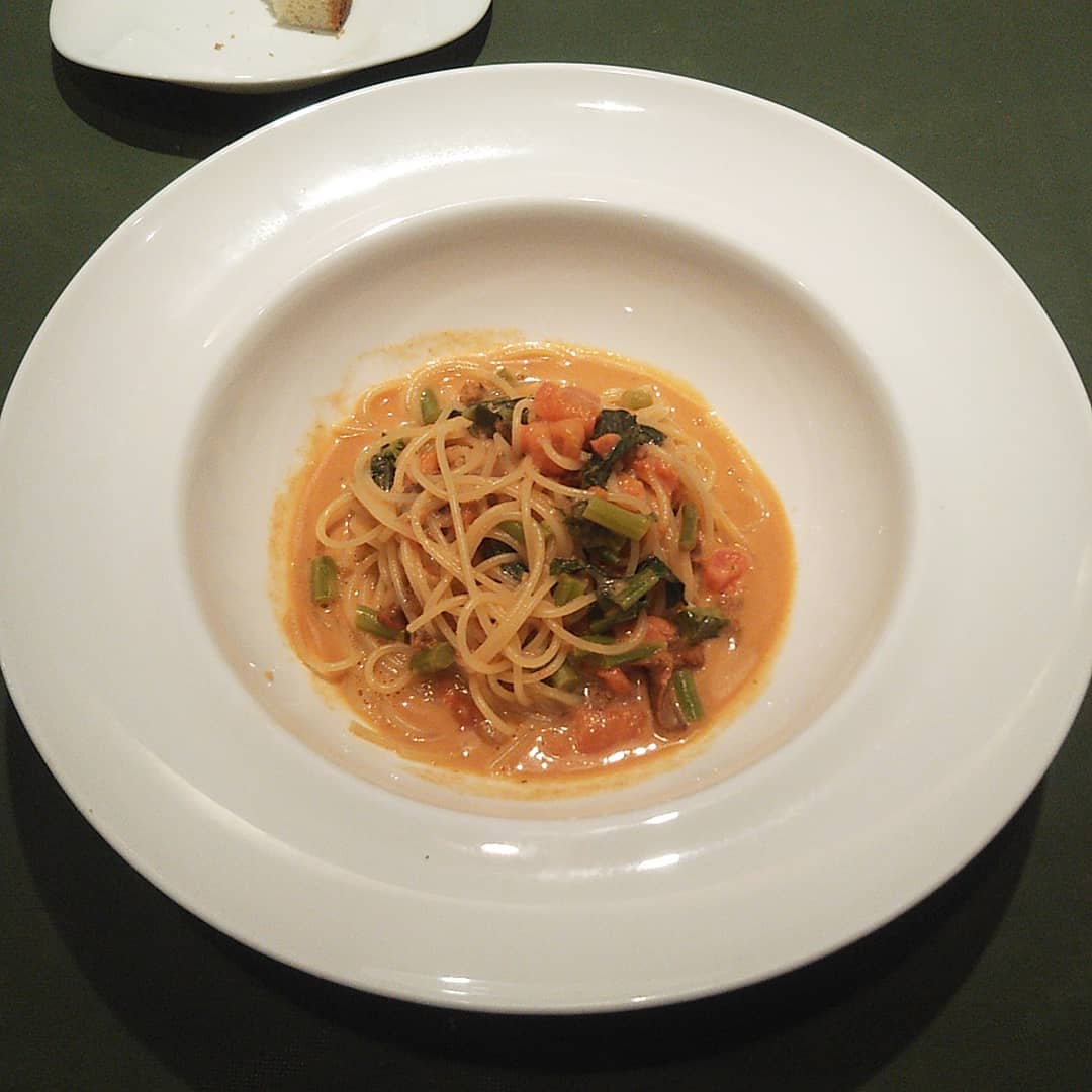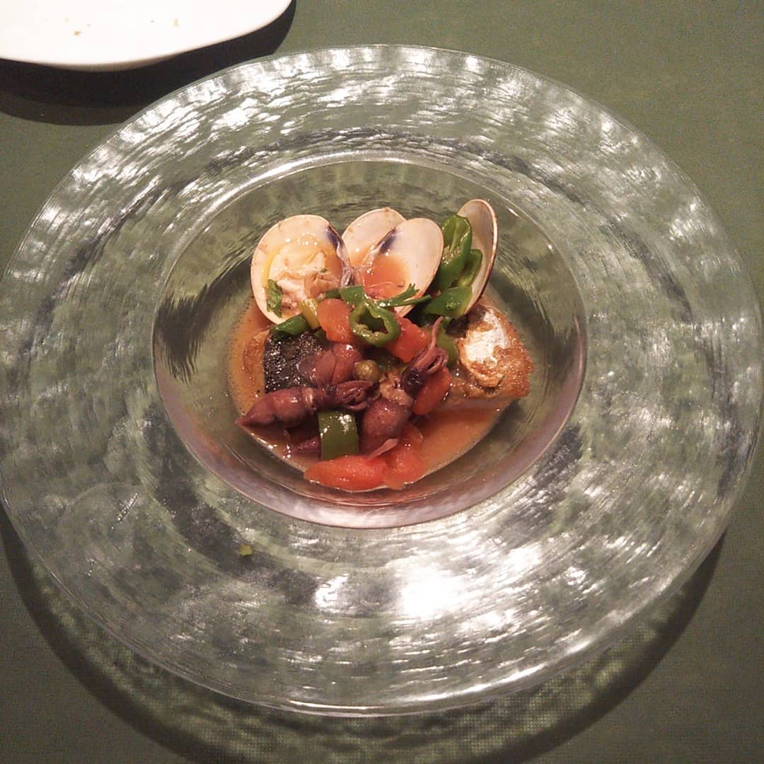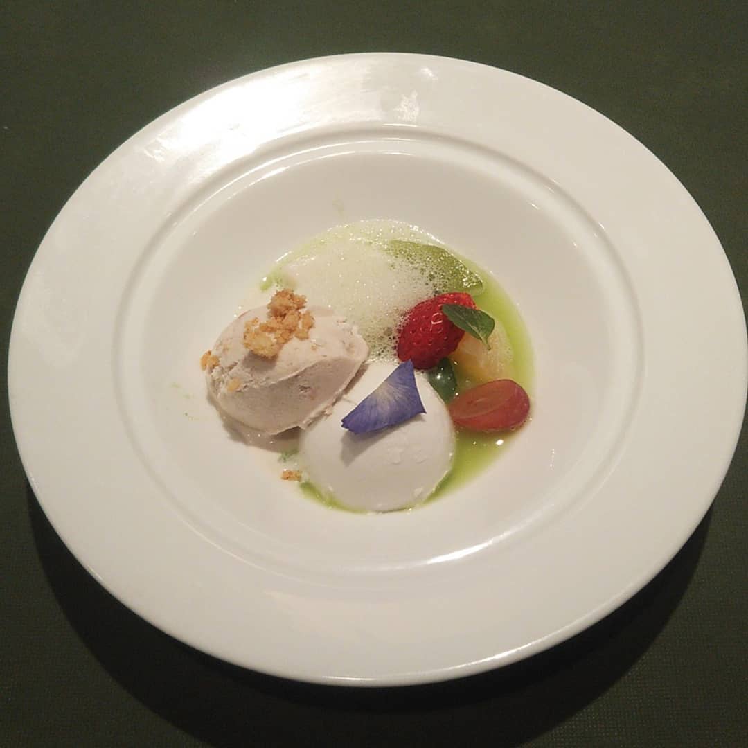前菜は豚や鮮度抜群な魚介を使った盛り合わせ。パスタは雲丹とトマトのスパゲッティ。魚料理は鰆のローストに蛍烏賊のソース。デザートはイチゴとチーズのソルベ、ココナッツのムース、白インゲン豆のニョッキ等の盛り合わせ。どの料理も素材の良さを活かしつつ、ソースや食材の組み合わせが斬新。とても美味しかった。