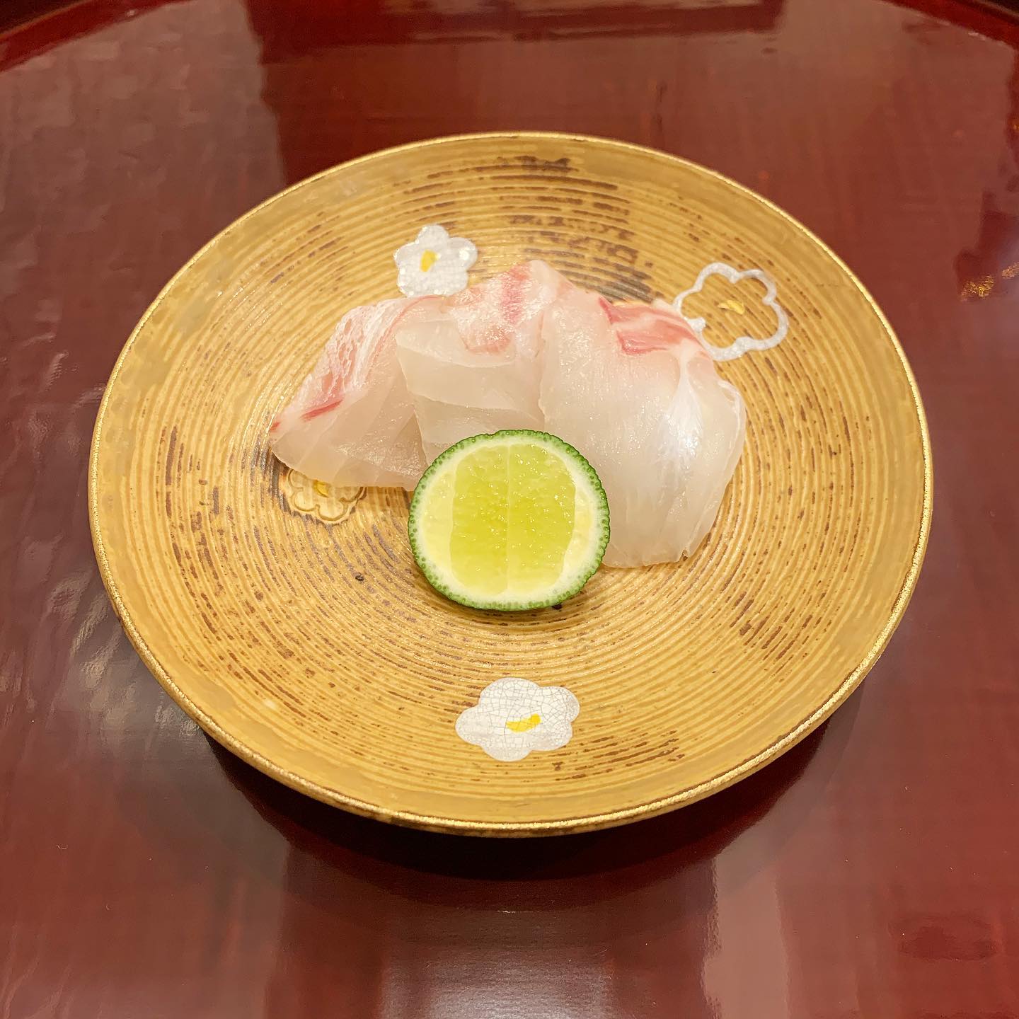 明石の鯛の刺身。カボスを絞ってさっぱりいただく。