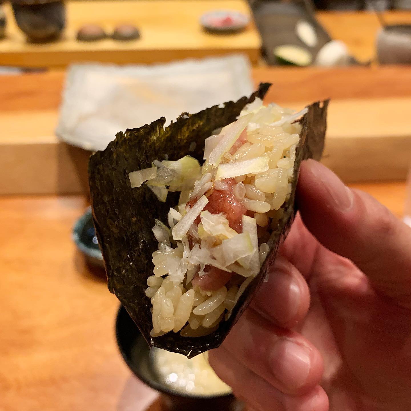 もちろん江戸前も好きだが、あさ海さんの握る小倉前の足し算の握りは本当に大好き。ふとした時に恋しくなるだろうなぁー。最後のあさ海さんで初めてボタンエビをいただきました。卵と雲丹を合わせて贅沢な味わい。赤むつ、タイラギ、太刀魚はいつも通りの旨さ。まぐろは最近よく目にするエンガワ。脂がしつこくないのに絶妙なとろけ具合で絶品。鰯は小ぶりだが存在感抜群。あさ海さんの〆具合も大好き。そして毎回感動するのが中落ち手巻き。天野さんも絶賛していた手巻きは海苔、シャリ、中落ち、葱、山葵が黄金比率。お腹いっぱいでもいくらでも食べたくなる逸品。