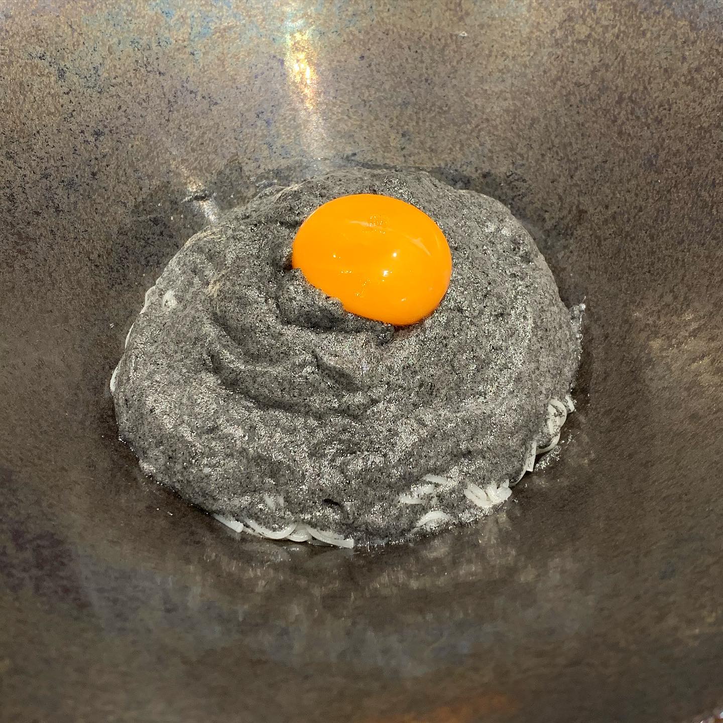 麻炭のふわふわしたメレンゲとトロトロの卵黄をよく混ぜて食べる。